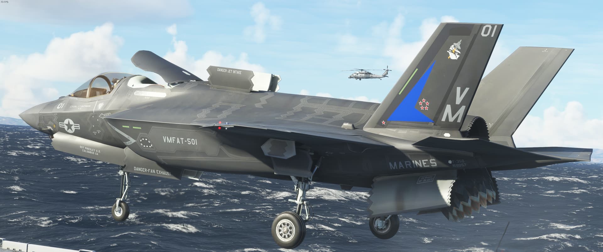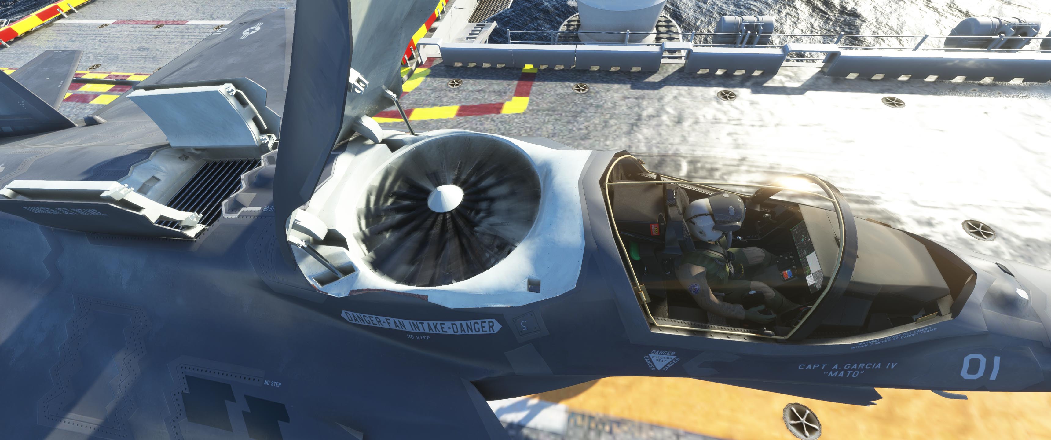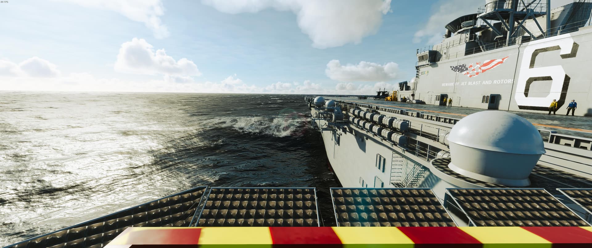 The ocean swells look pretty amazing with that surface wind, but I would like it a bit better if the ships moved and they had pitching decks. I was watching one of Ward Carol’s Tomcat RIO videos recently and heard him talk about an experience when Raven One series author Kevin Miller was his LSO during a rough seas recovery and how either Ward or his pilot saw the ship’s screws when they were in the groove. Frightening in real life, but might be fun in a simulator.