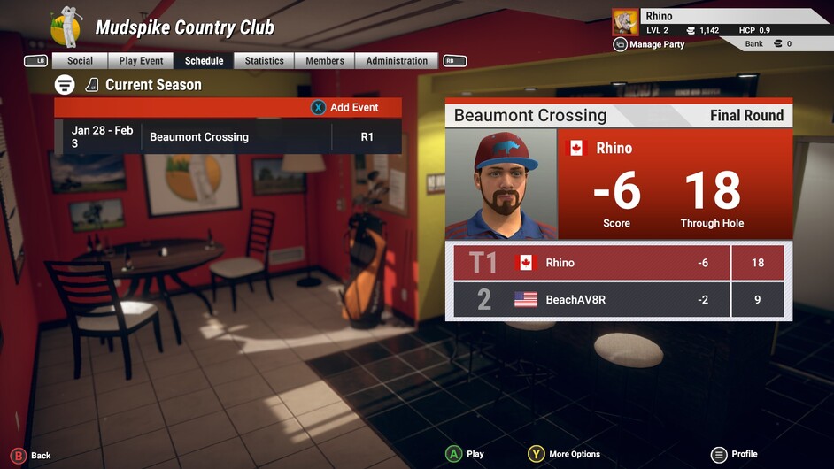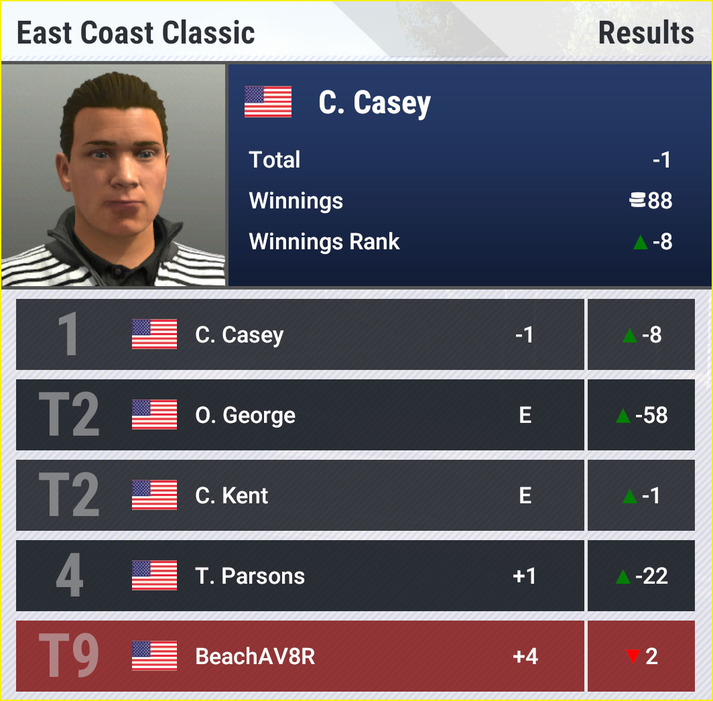 Continuing my “career” mode. Played the East Coast Classic at a Boston countryclub - definitely the hardest round I’ve played so far in the game. Winds were up to 15mph and I was just all over the place. I had closed to within two strokes of the lead with four holes to go and then I had a disastrous double-bogey which took me out of contention.