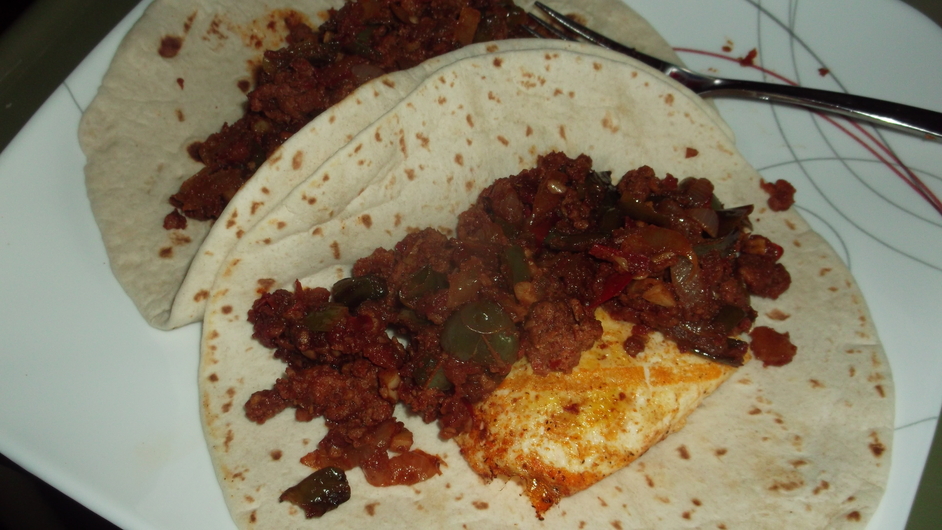 Onto the plate the tortilla goes, then the egg, then scoop some of your chorizo mix ontop.