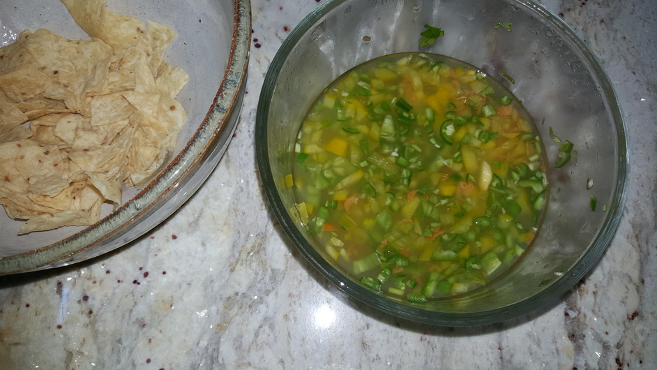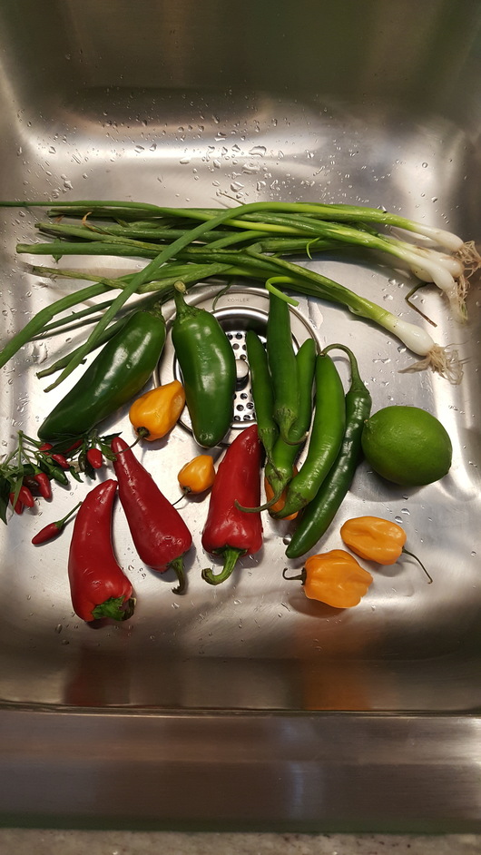 A few ghost peppers, some sarranos, a yellow and a green from the garden. Cover in water, stir in a tablespoon of Kosher sea salt, and squeeze in a lime.