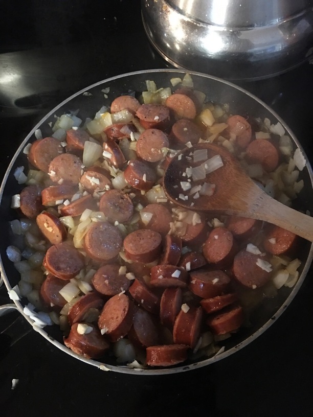 First steps of preparing slow cooker low-country chicken bog. Browning the Cajun sausage, onions, and garlic (the house smells awesome!). Next into the slow cooker with 3 cups of rice, 4 cups of chicken broth. In 5 hours, add two pounds of pulled rotisserie chicken, simmer another hour. Top with some chopped green onion and a side of cornbreadā¦(and a beer of course)ā¦