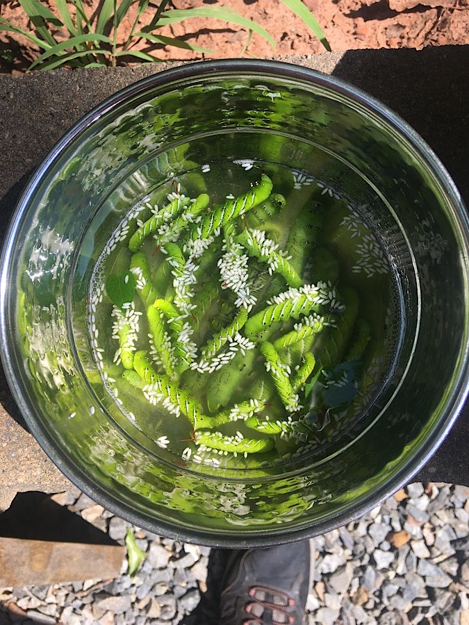 Tomato Horn Worms invaded the tomato gardens and did a number. I’m hoping I got most of them and there might still be enough time in the season to reap some additional tomatoes. The white flecks (in case you didn’t know) are the eggs of wasps that lay their eggs on the worms. They burrow in, hatch, and consume the worm. Brutal life eh? You could let the Horn Worms that have the eggs on them just go on since you’ll be hatching more wasps to help control the population in the long term…but in a small garden, just a few Horn Worms can wipe out the tomato leaves…