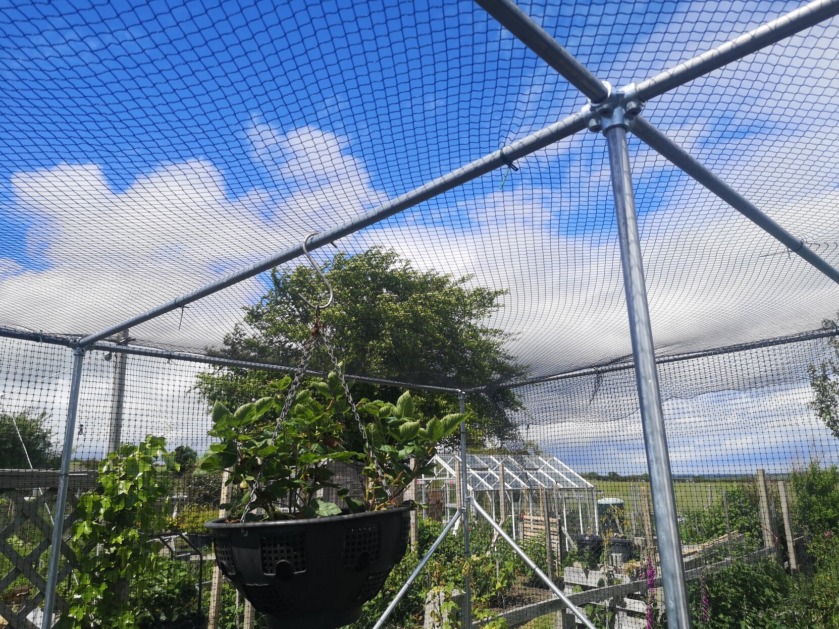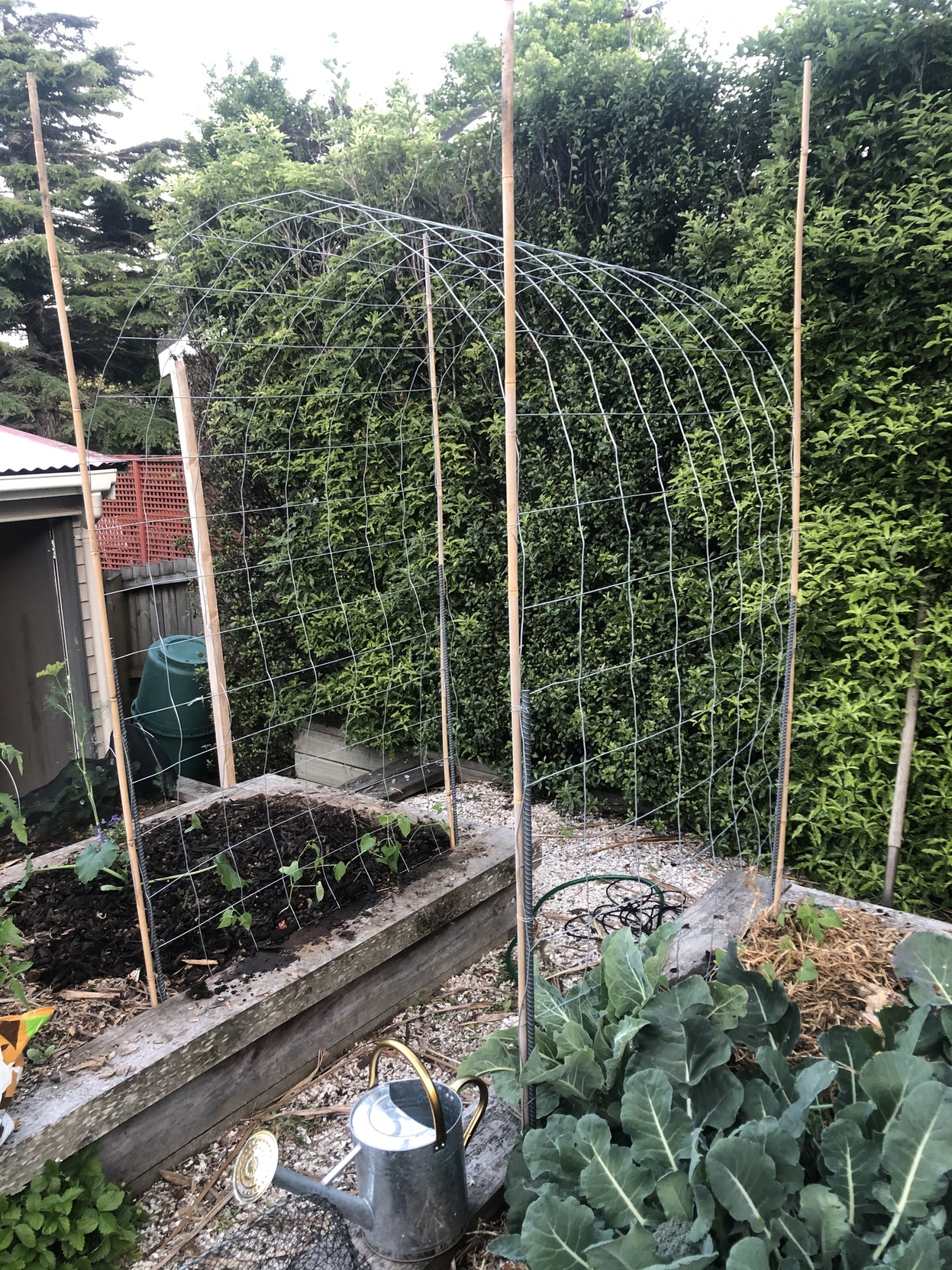 Pretty rough assembly- just some rebar and bamboo stakes with 150mm aperture tomato mesh - but it should do the trick. The idea is that the plants climb over the top and the beans etc. hang down between the wires, easy to pick.