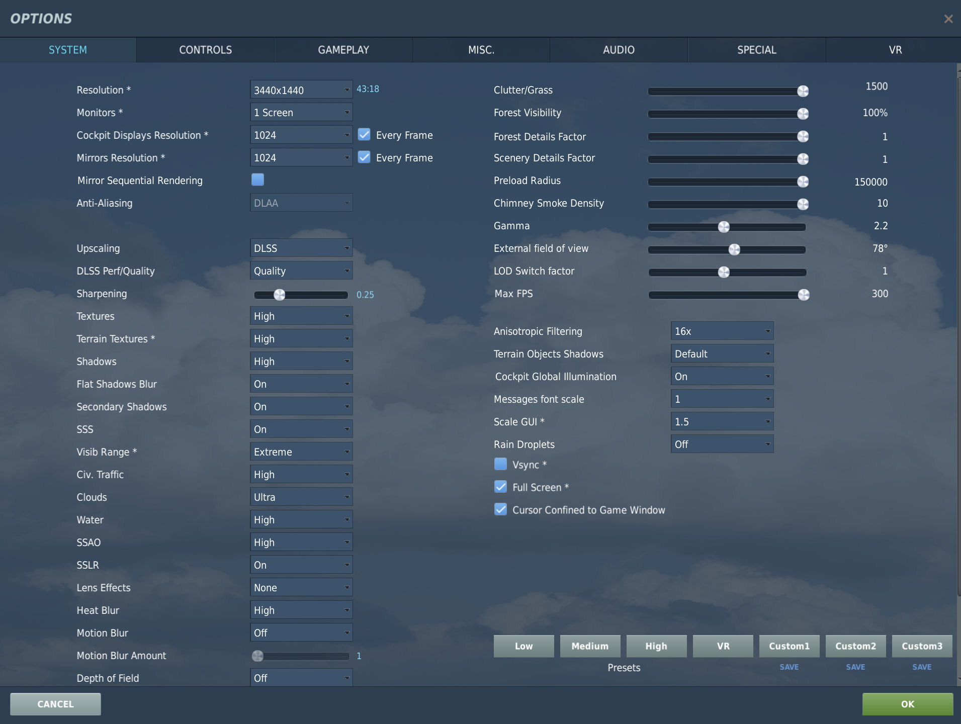 Somehow I got things about right. With multiple cloud layers (Overcast, bases ~7,000 ft?) I can ‘rage’ around Bagram and Kabul at 500+ knots & 500 ft, doing hard turns; zooming up in a loop then pointing the nose straight down at the center of Kabul, doing aileron rolls til I have to pull out - and it stays at 90FPS (max FPS setting too). 95% of the time. It’s a rush. Before it would be choppy, now it just makes me dizzy.