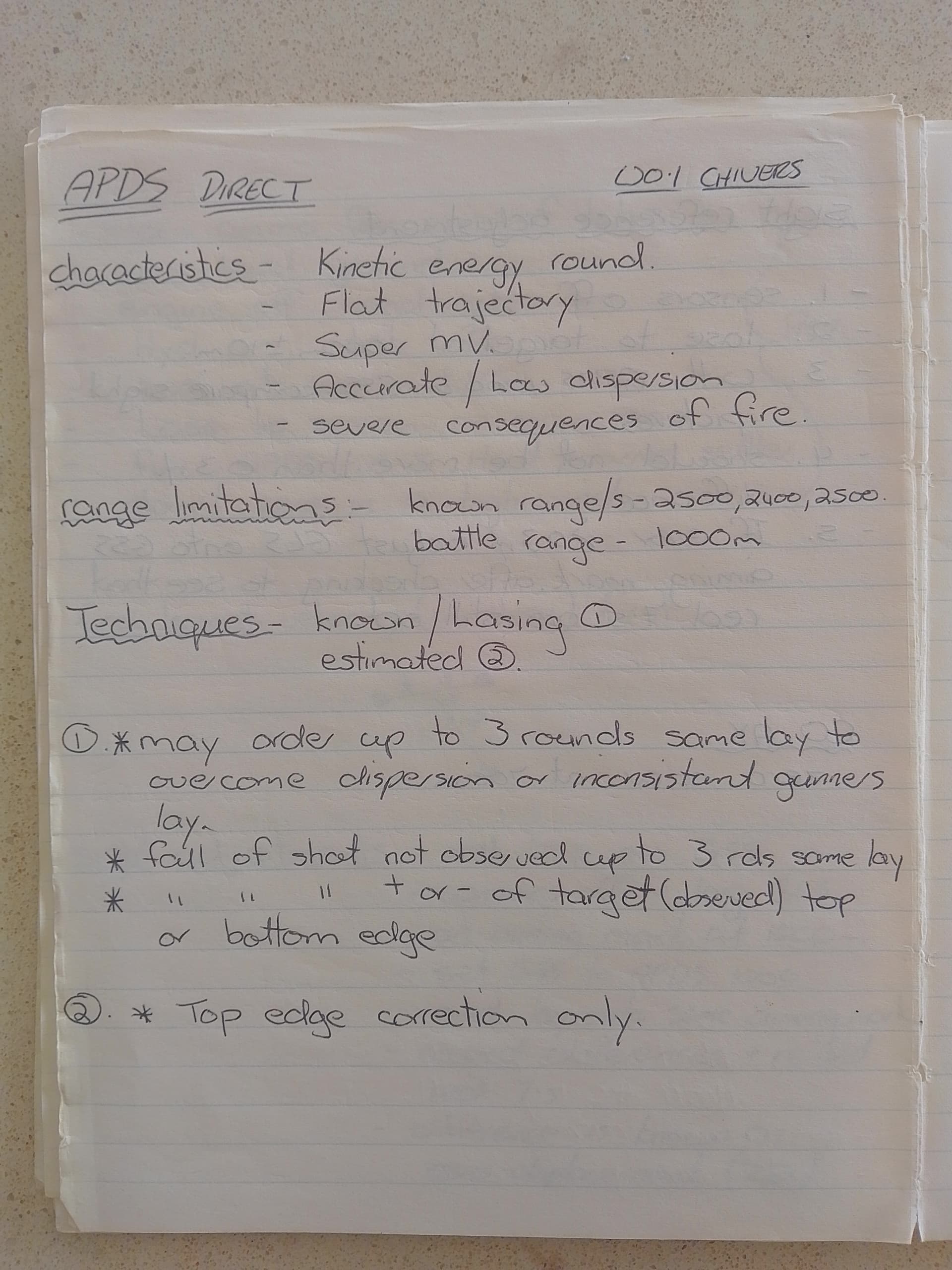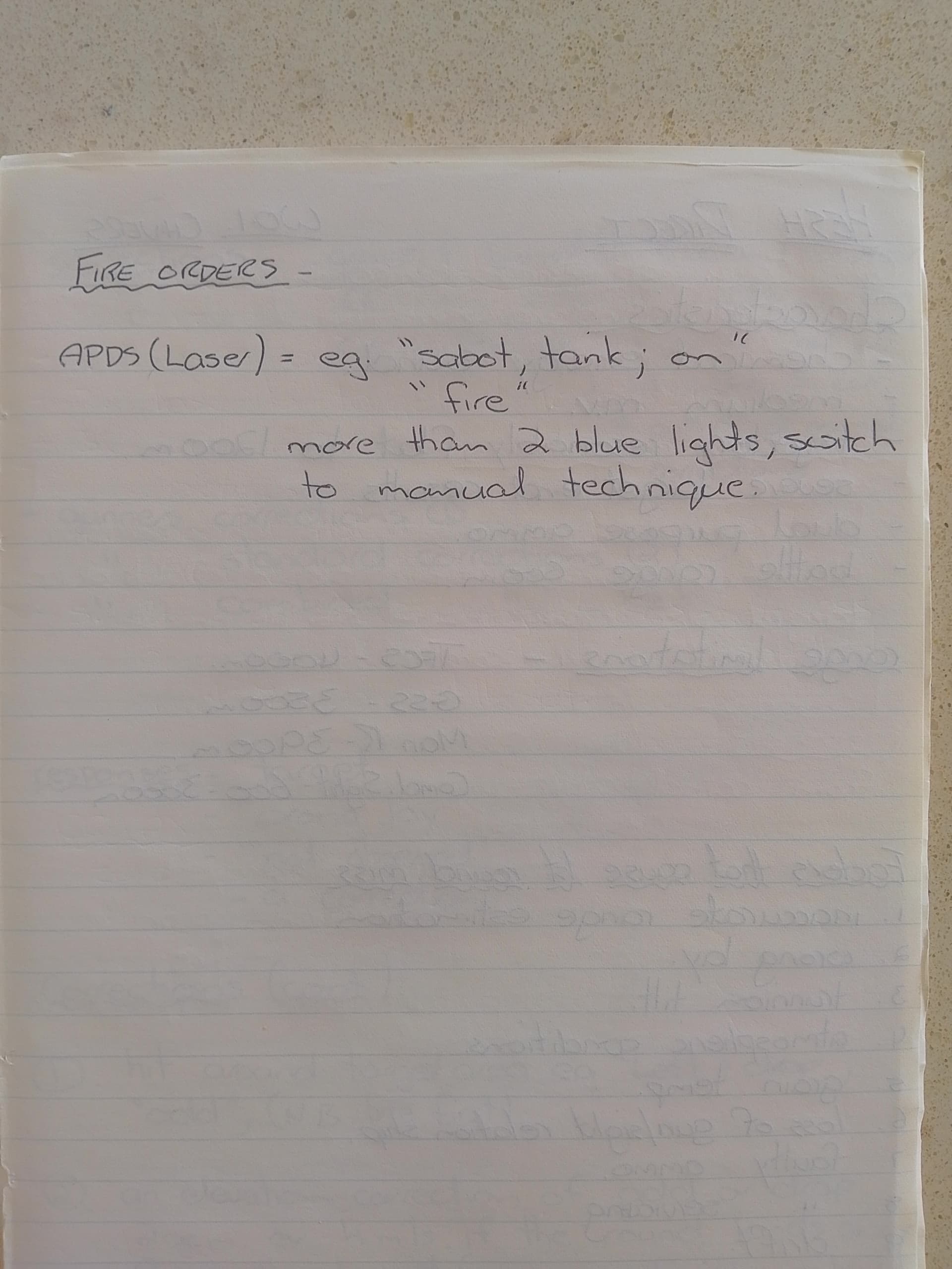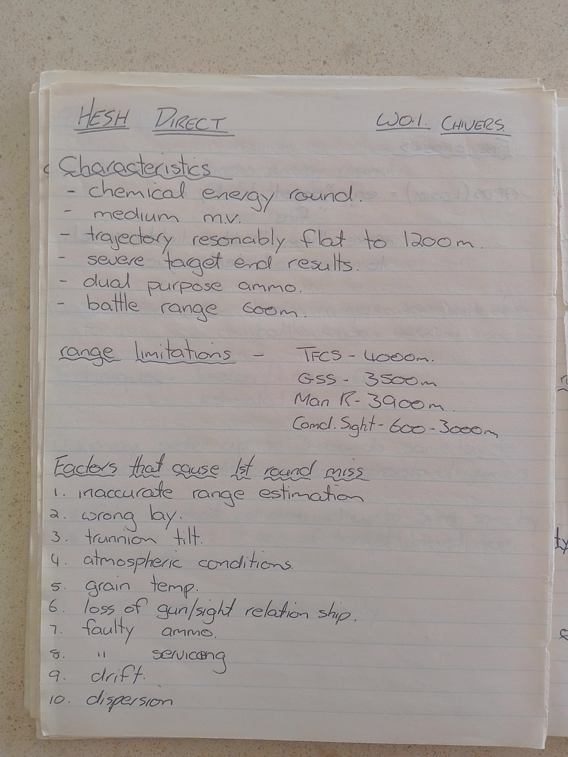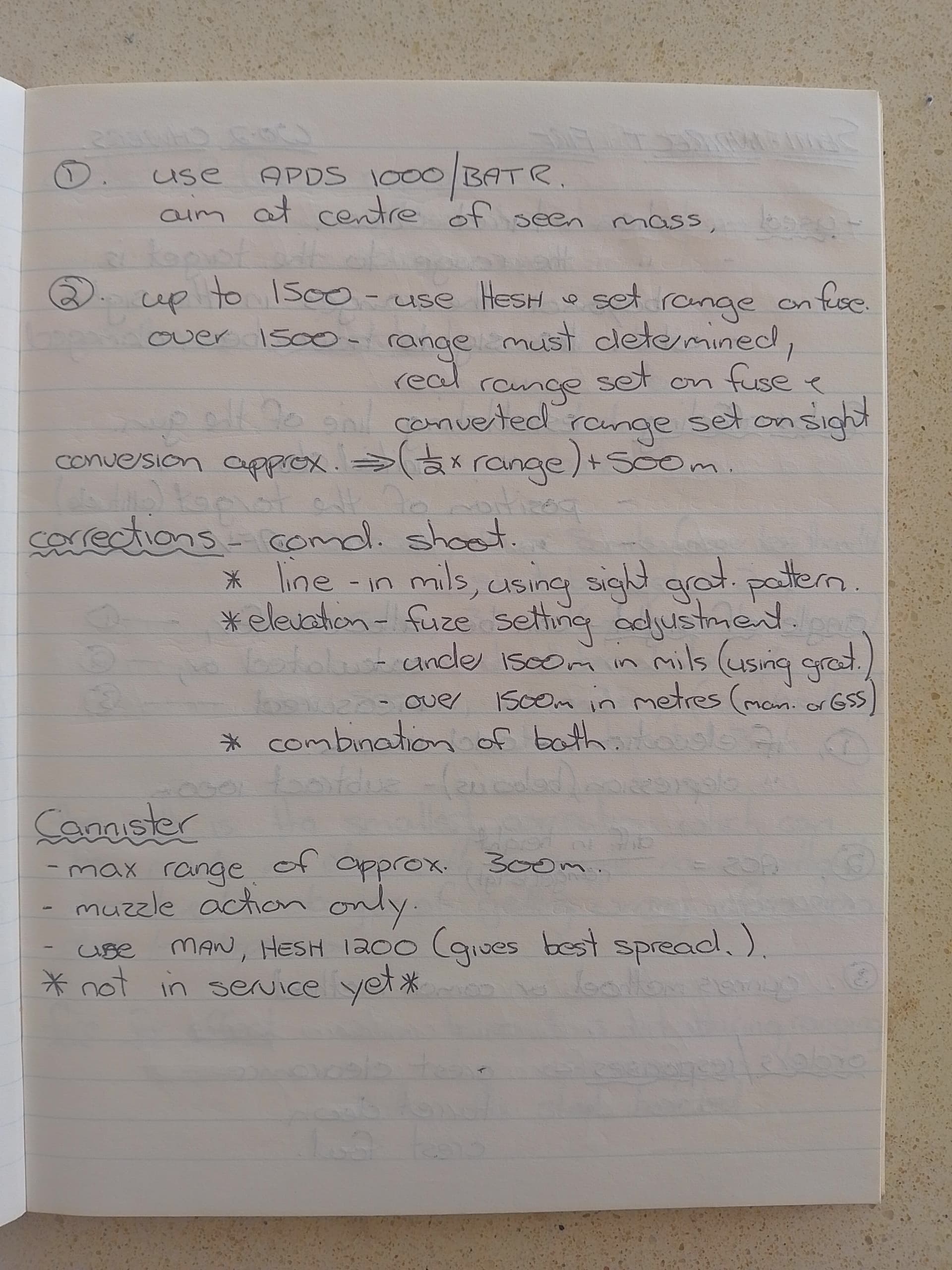 Because my old notebook has generated more interest than anticipated here are some more pages. Not everything, but the most interesting and kind of applicable to GHPC. I am missing some pages e.g. HEAT Direct, but I am pretty sure that except for the characteristics and range limitations it was basically the same as HESH.