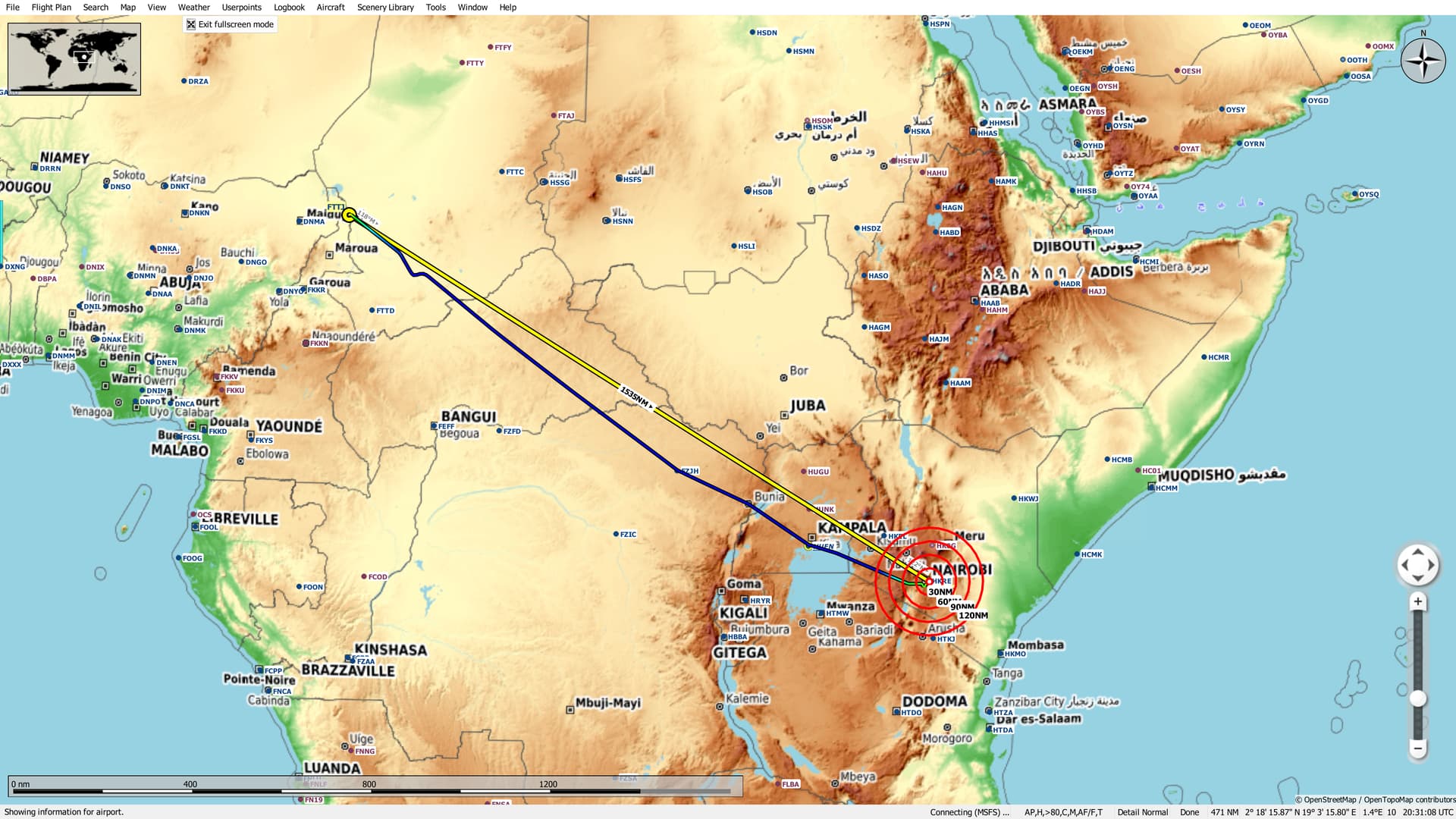 Continuing my trek towards Kilimanjaro, I plotted a very reasonable 1500 mile(ish) leg to Nairobi. I had initially hoped to use some of city’s more traditional fields but, in the end, the long runways of Jomo Kenyatta lured me in.