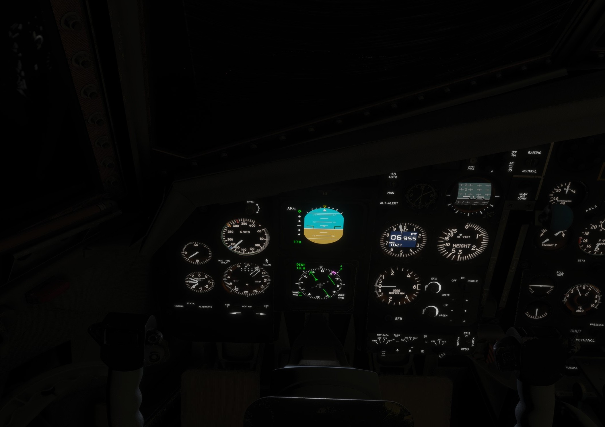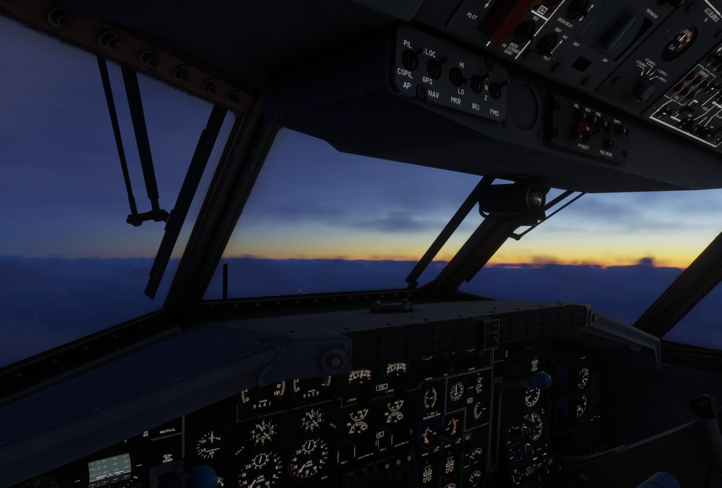 Oopsie, watch the rpm needles - we’re out of fuel. First the right engines quit, then the ones on the left.