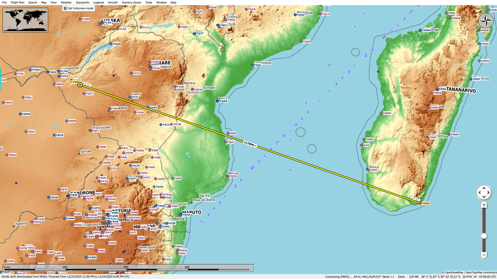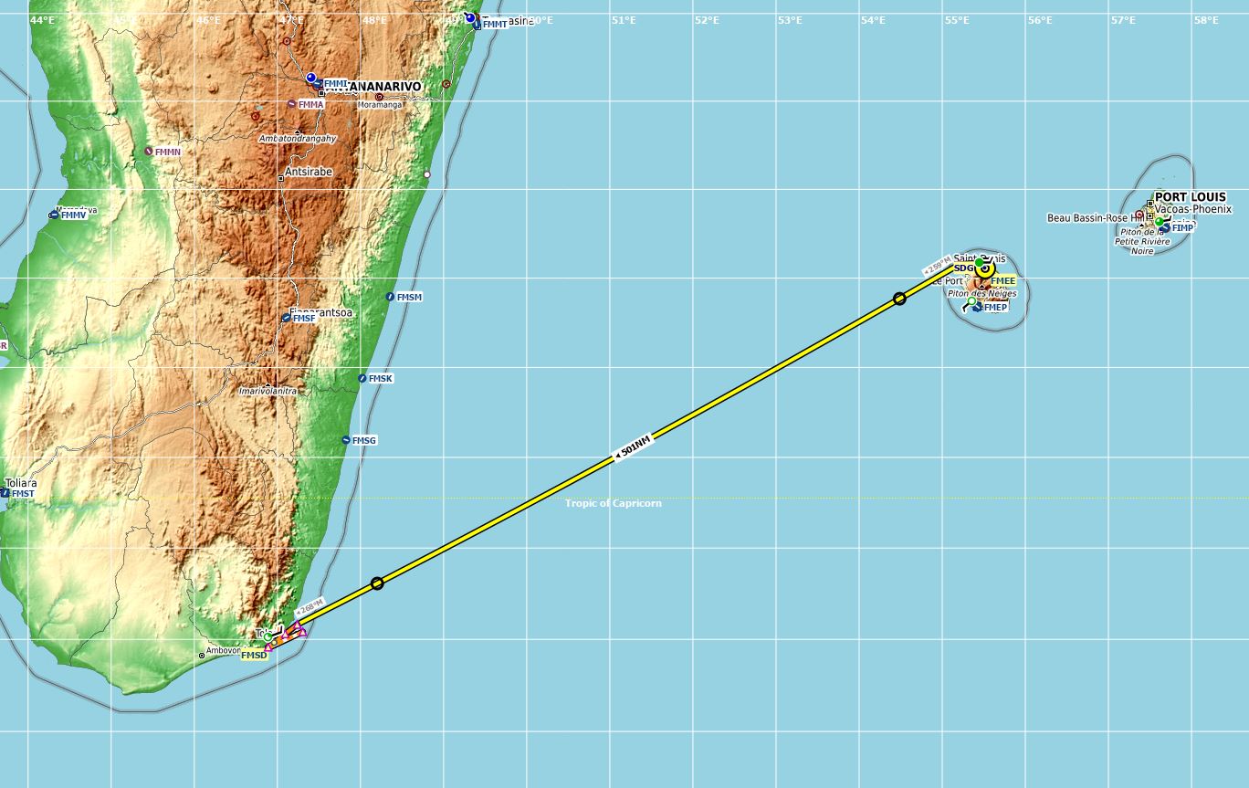 Currently flying the leg from Grand Comores to Madagascars northern tip. I tried a few days before, but was called to other duties and when I returned to the cockpit I see my plane bouncing from crash to crash, so I decided to refly the leg.
