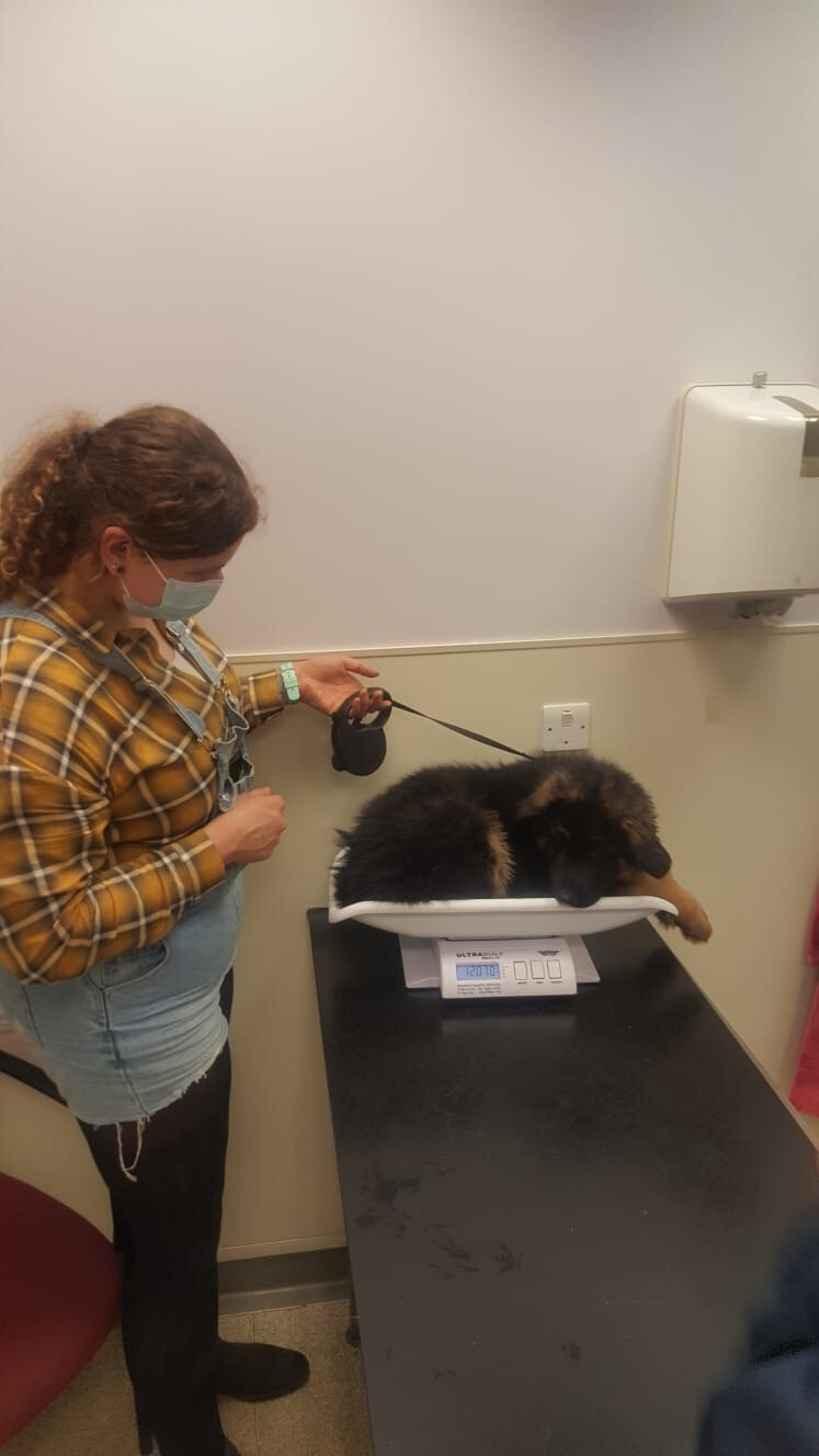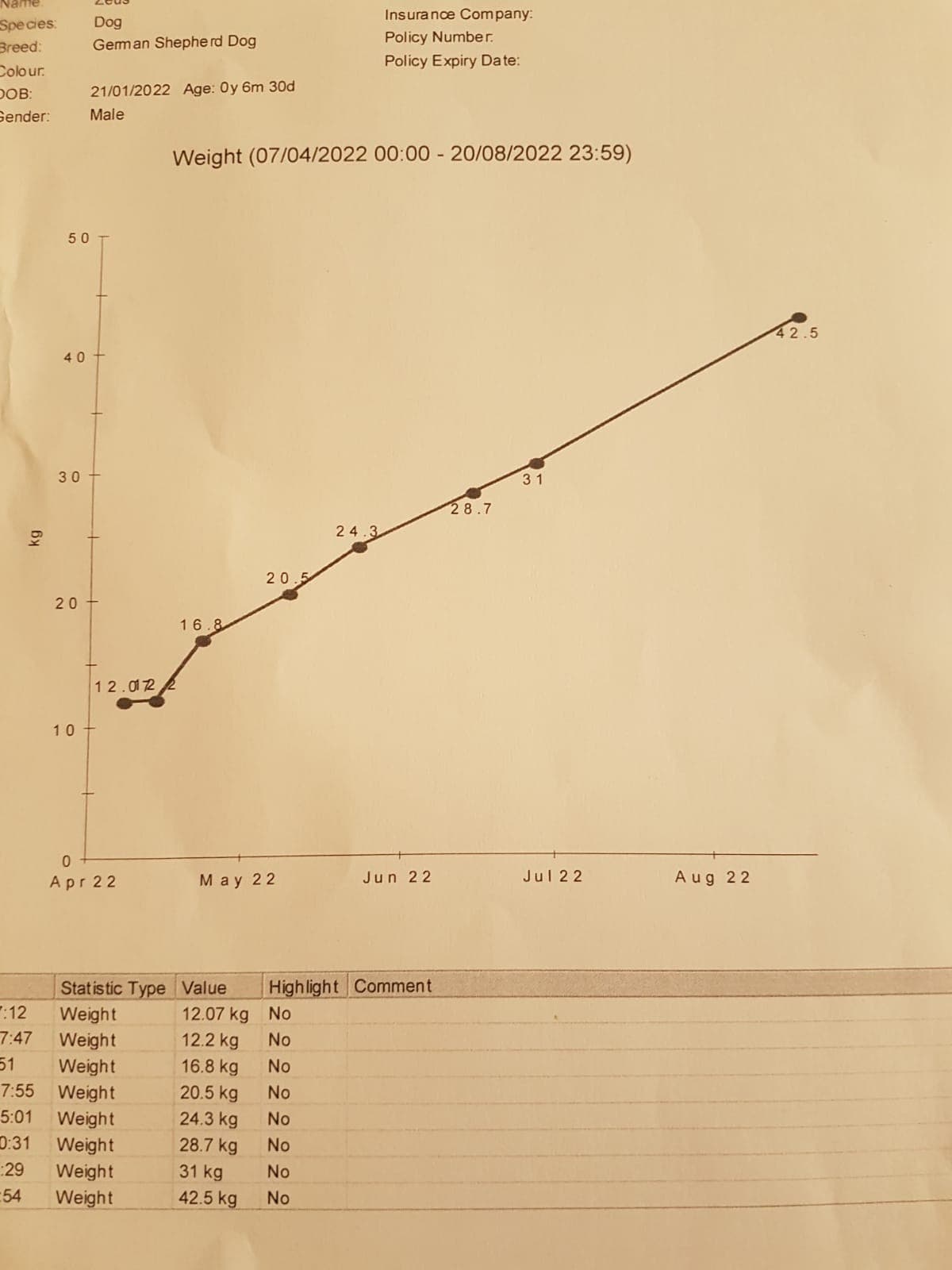 ZSU23-4 Zeus when I first weighed him at the vets compared with him today (next to the cat scales he was first weighed in. then a chart of his weight progression. He has at least six more months of growth to come.