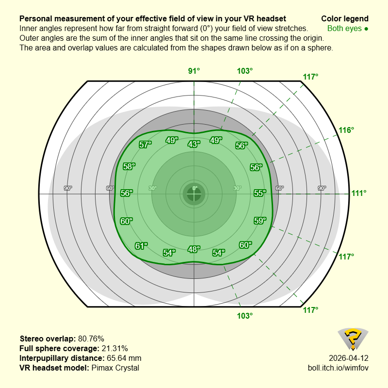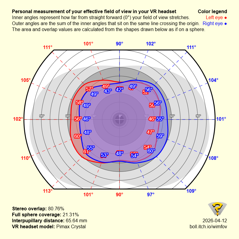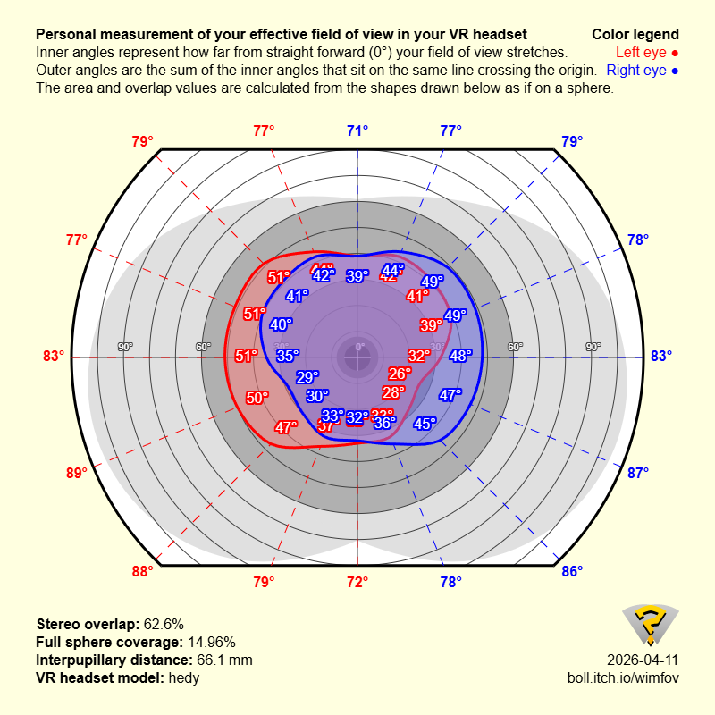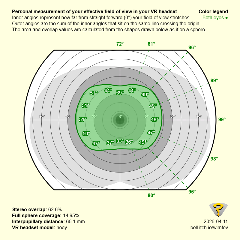 Before unplugging the Varjo Aero I did some FoV testing in the WIMFov app. I tried it with the Pimax too, as a comparison. Pics below. I donāt know why it says VR Headset Model: hedy, for the Aero, but it does. First pics are eyes separated and the last two pics are eyes combined.