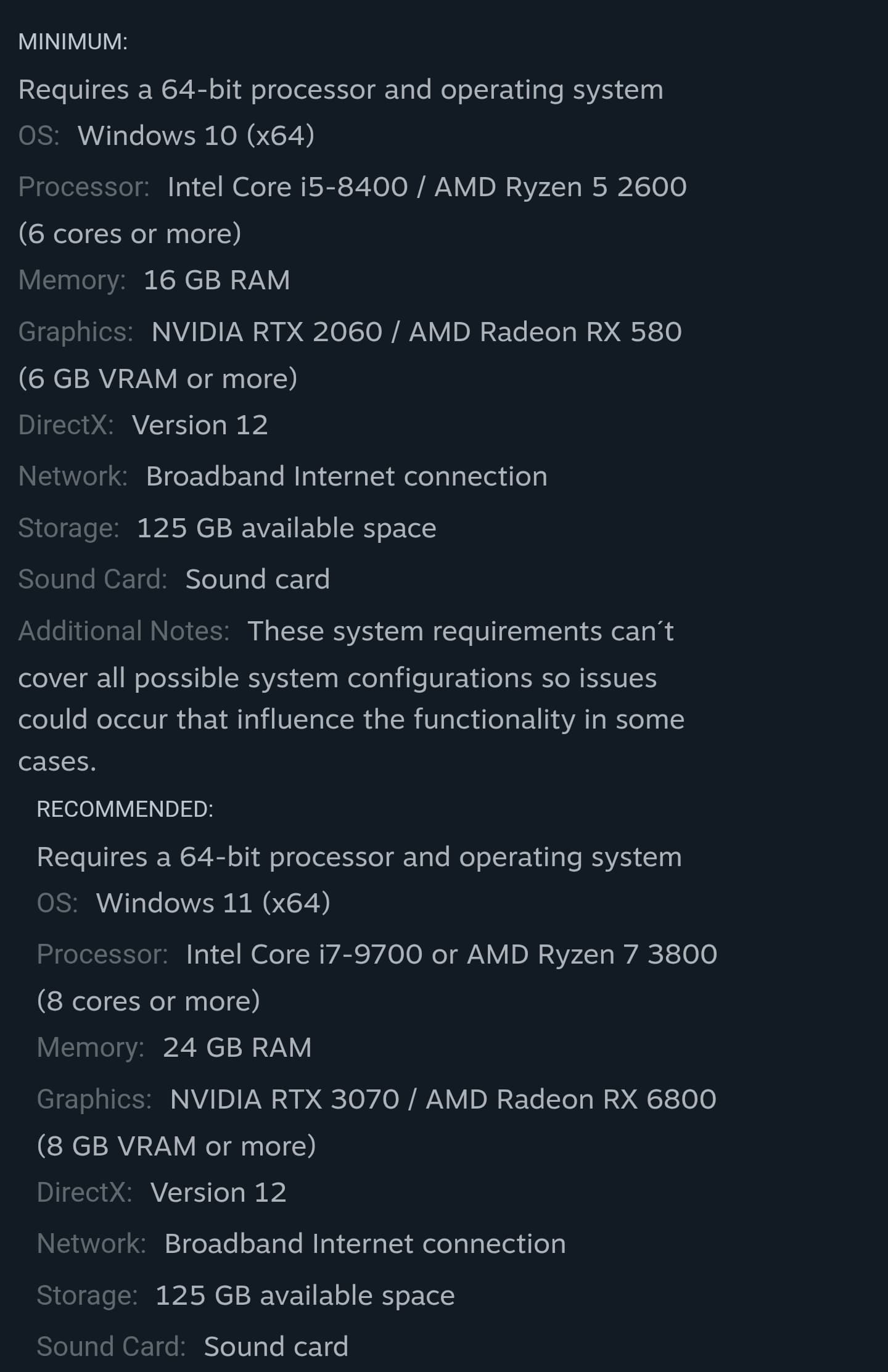 As far as I know Recommended PC Specs are still not up on Steam Store Page…nor is Question of Day 1 VR support,although You can Pay/Pre-order the game for November release.