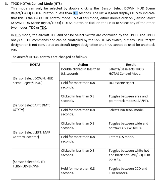 ) is the 0.8 second shortcut functions - are there some on the Sensor Select castle, something about near/far zoom etc. I need to check those out if they are in the module now. Itās in the pocket guide under 'TPOD HOTAS Control Mode (HTS) but havenāt played with it yet.