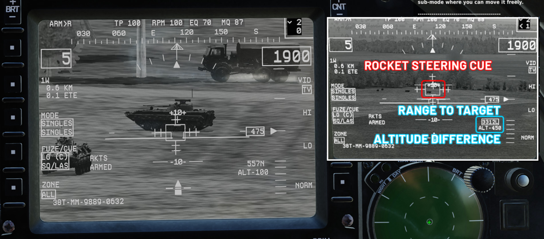 Tracking a moving target. The constraints on the APWKS are narrower than those of the Hellfire…and apparently you can use the rockets for air-to-air kills if you can find a willing target. I had never used the APWKS on the Harrier…so this is all new to me.
