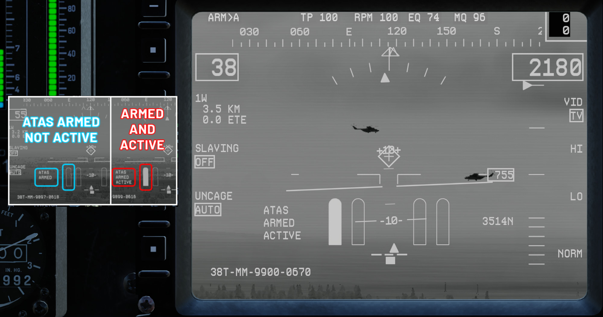 This morning we head to the training grounds to see the different modes and indications of the Aircraft Survivability Equipment (ASE). With only 30 flares in the system - your exposure time needs to be limited. I intend to probably just operate the system in automatic mode…although the tutorial does indicate that the flare dispenser in auto will eject flares regardless of the source of the missile (no friend or foe)…so if you are flying around with some buddies popping off missiles…you might be better off in manual mode.
