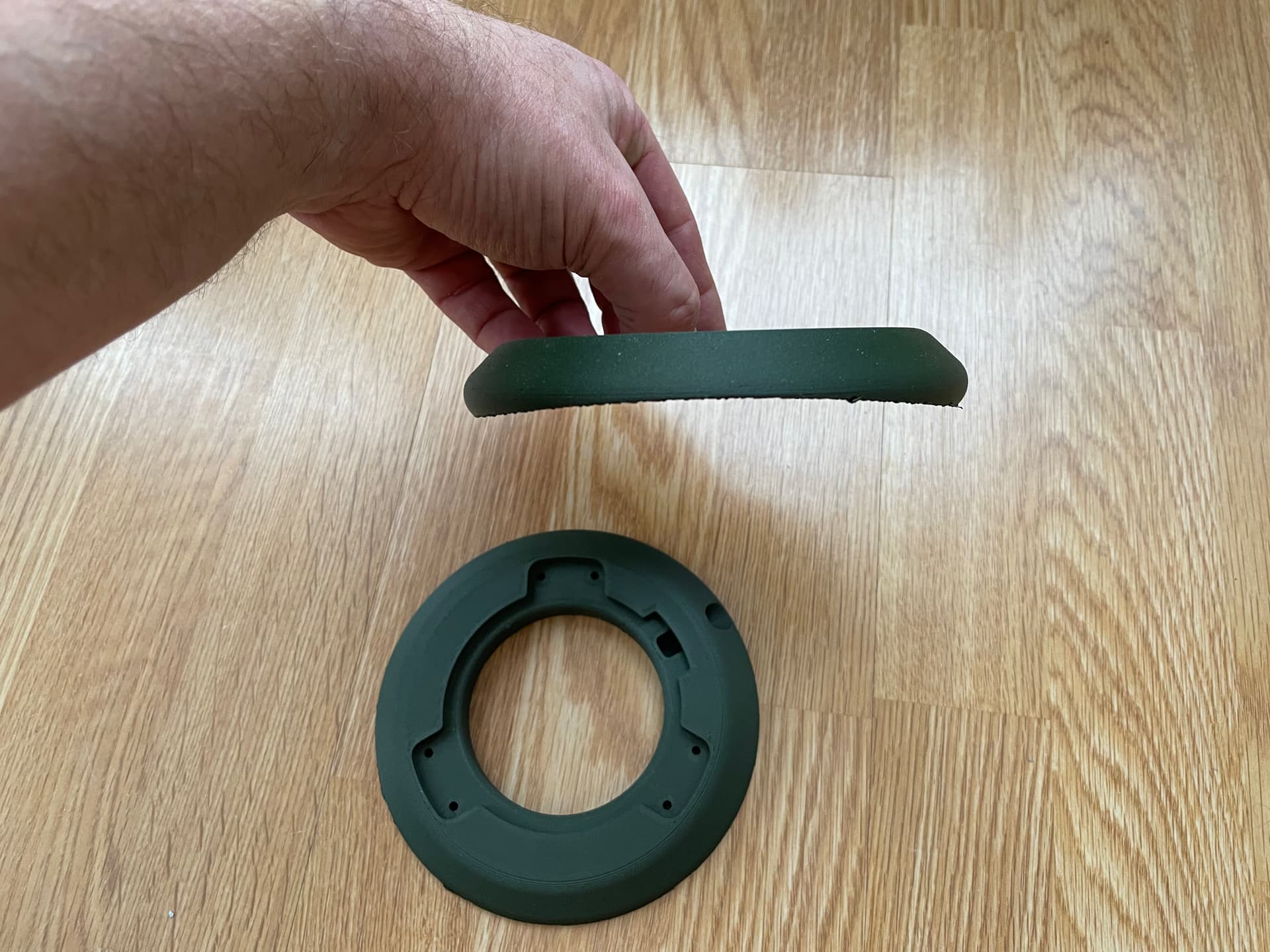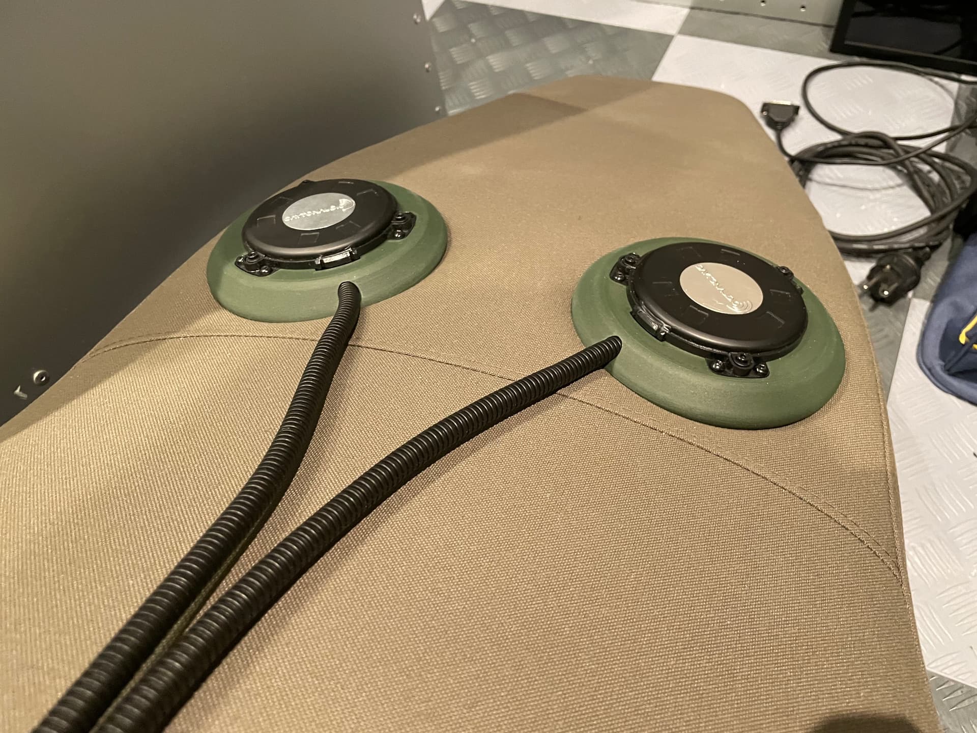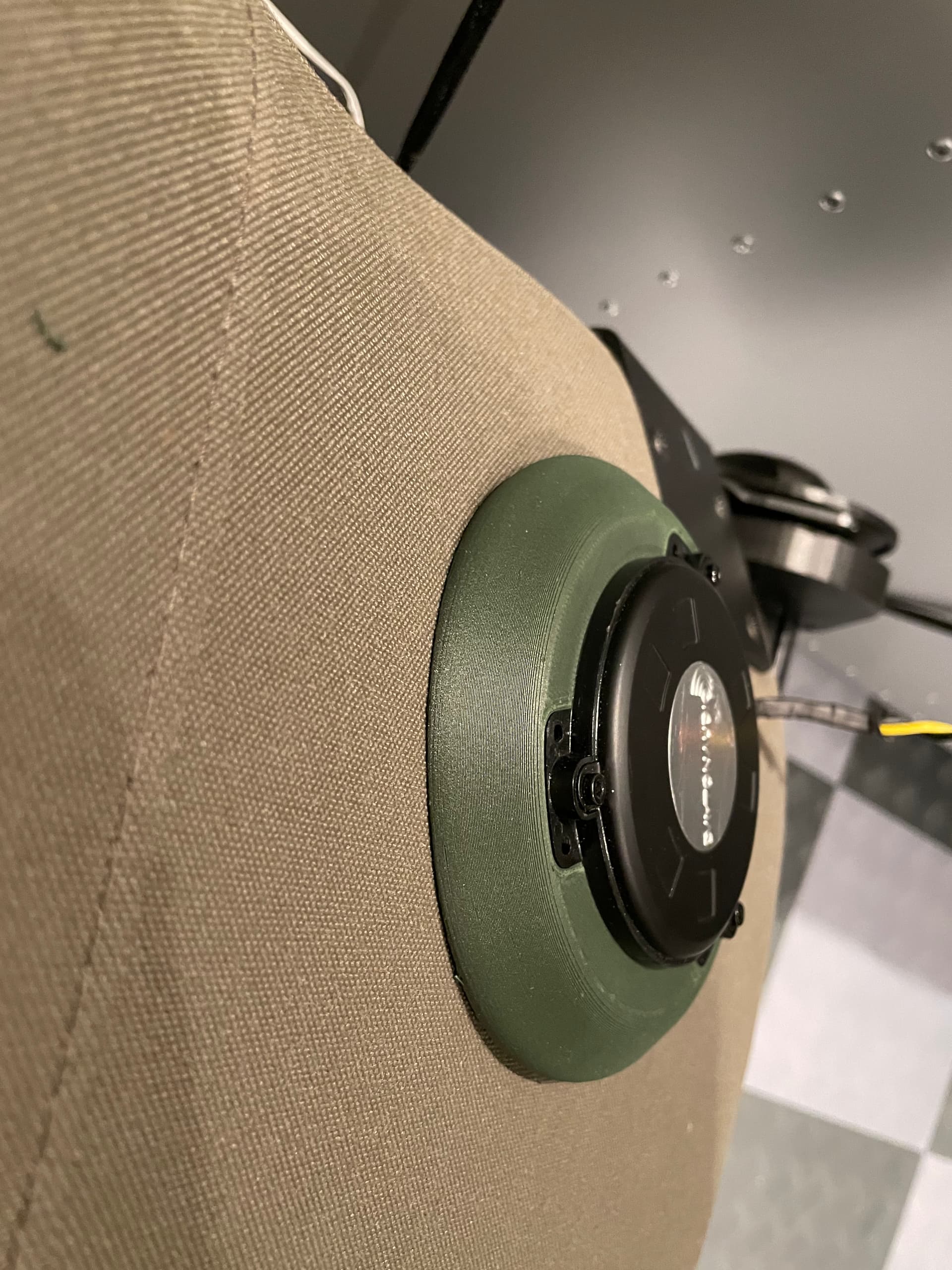 The bass shakers are designed to be mounted in holes, so I designed frames for 3D printing, making two flat ones and two that will fit the convex shape of the backside of the seat.