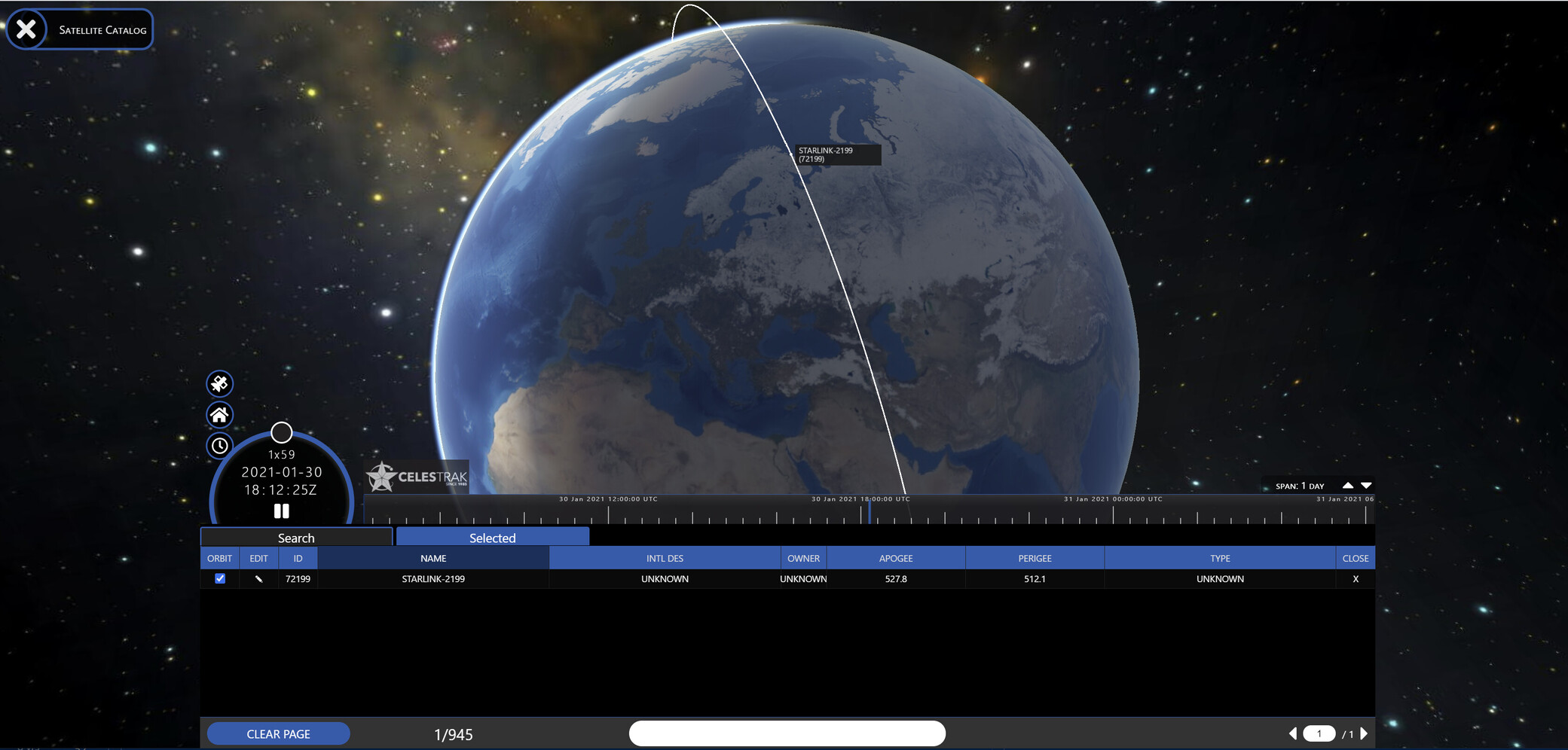To find the latest polar orbits just bring up the ‘Satellite Catalog’ option, and sort INTL DES until you get ‘UNKNOWN’ (that’ll be the latest) and then you can hit + to add then and see their paths etc. Either that or search by the ID in my screenshot above.