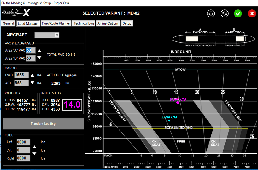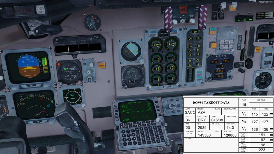 Holding the CG CHECK button to see if the fuel pumps distributed the fuel correctly, giving me a balanced Center of Gravity. The CG should be good (and it is) since the fuel pumps were set to AUTO mode. When lined up on the runway, I also check that the correct heading is entered on the Beam Compass (194 for the first leg).