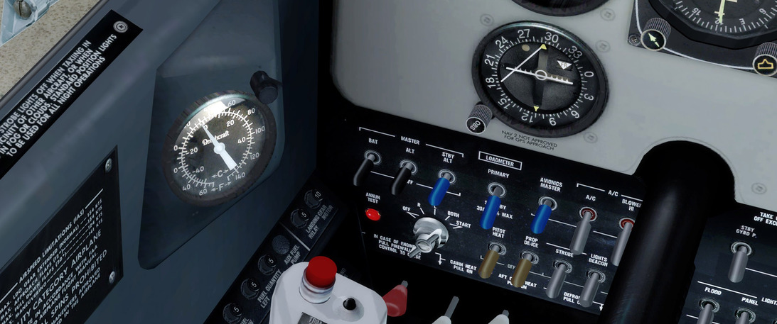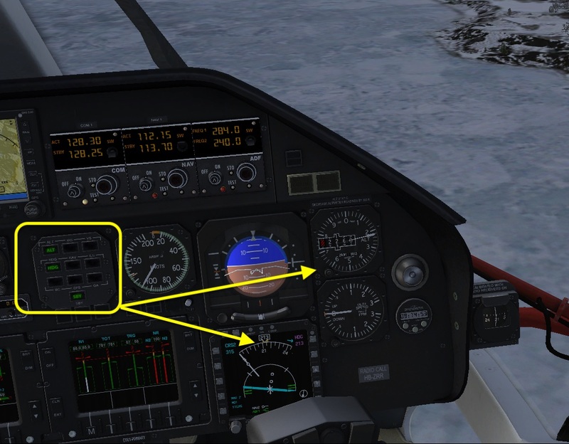 I then level off the aircraft and set up the IAS/ALT autopilot mode selector to ALT (Altitude Hold) and pull the ENGAGE knob. Simple as that. You can also monitor the servo loading on the front panel. If you want to use HEADING HOLD, set the Autopilot Heading Select Knob to the desired course on the Beam Compass, then pull on the TRACK knob to arm Heading Select mode.