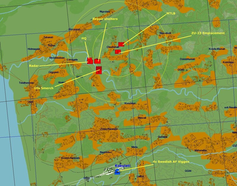 The Zu-23 emplacement is within range, but if we do the Viggen thing and fly in fast and low, the built up area in between should give cover. The main target is the Smerch batteries, with the radar and command centres being the secondary.