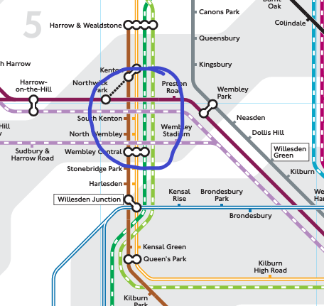 I used to commute accross London through that area to Northwood every day on the Metropolitan Line (maroon line crossing east to west). The Met Line is part of the London Underground but the trains at that time were different to the ones on all the other underground lines in that they had very thick cushions on the seats. Upon riding the train it soon became clear that this was a design choice to avoid the need for any suspension. I learned to only sit in the center of the carriages to avoid being thrown off the seat over the bumpy stretch of track between Wembley Park and Harrow-on-the-Hill. ![]()