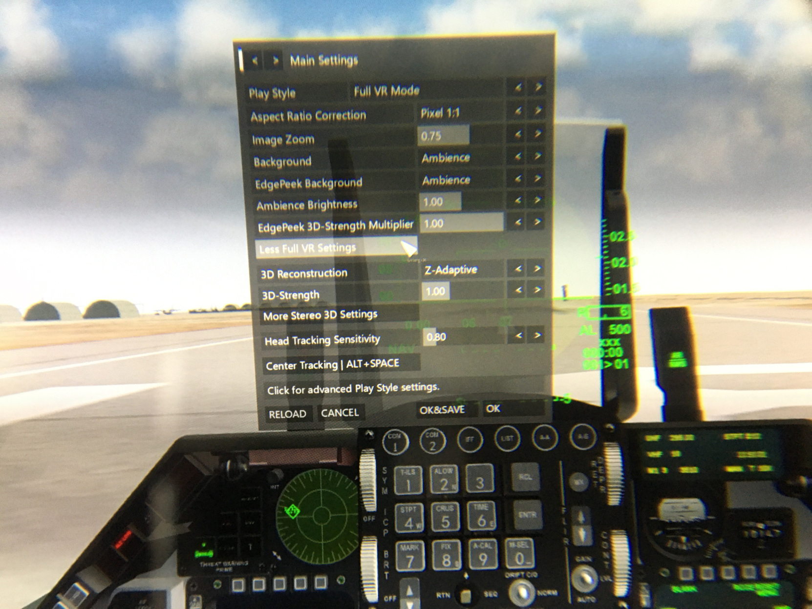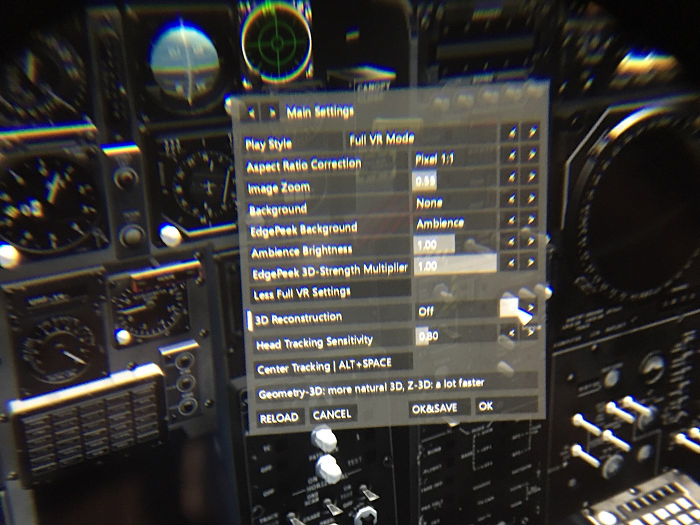 I’m not using any - it defaulted to the 2D immersion mode or whatever, and I just used the DEL key menu to change it to 3D. I won’t be able to look at the specific settings until tonight when I get home. I’m pretty sure it was G3D based. I haven’t messed with the field of view settings within SF2 ini settings in order to get a perfect 1:1 pixel and zoom level that fills the whole Reverb, so what I have is more like a slightly letterboxed view that is 3D. To bad I can’t put a helmet mask around the letterbox to make me feel like I’m wearing a helmet like you can do in VTOL VR. I’ll get you the specific settings tonight.