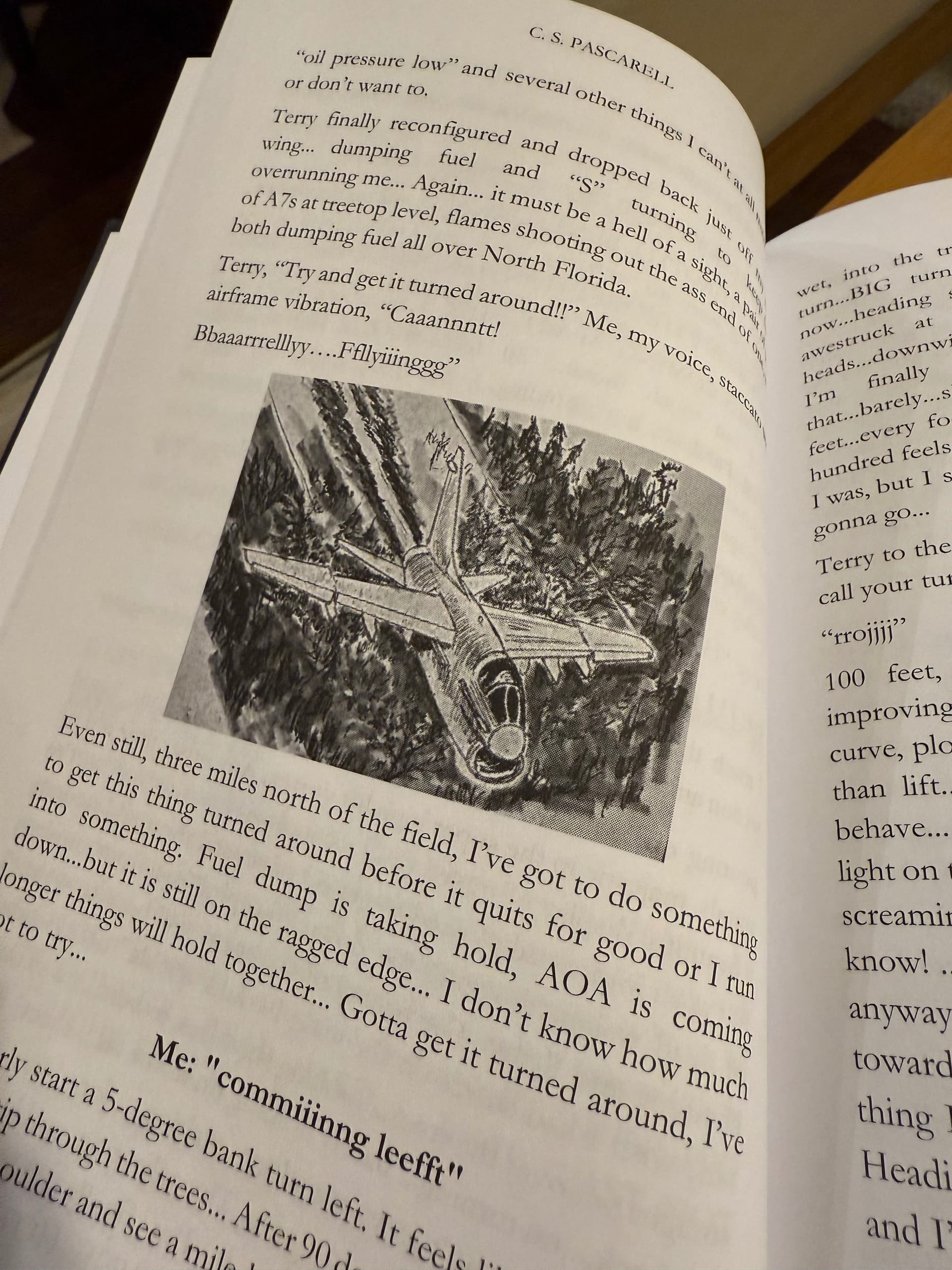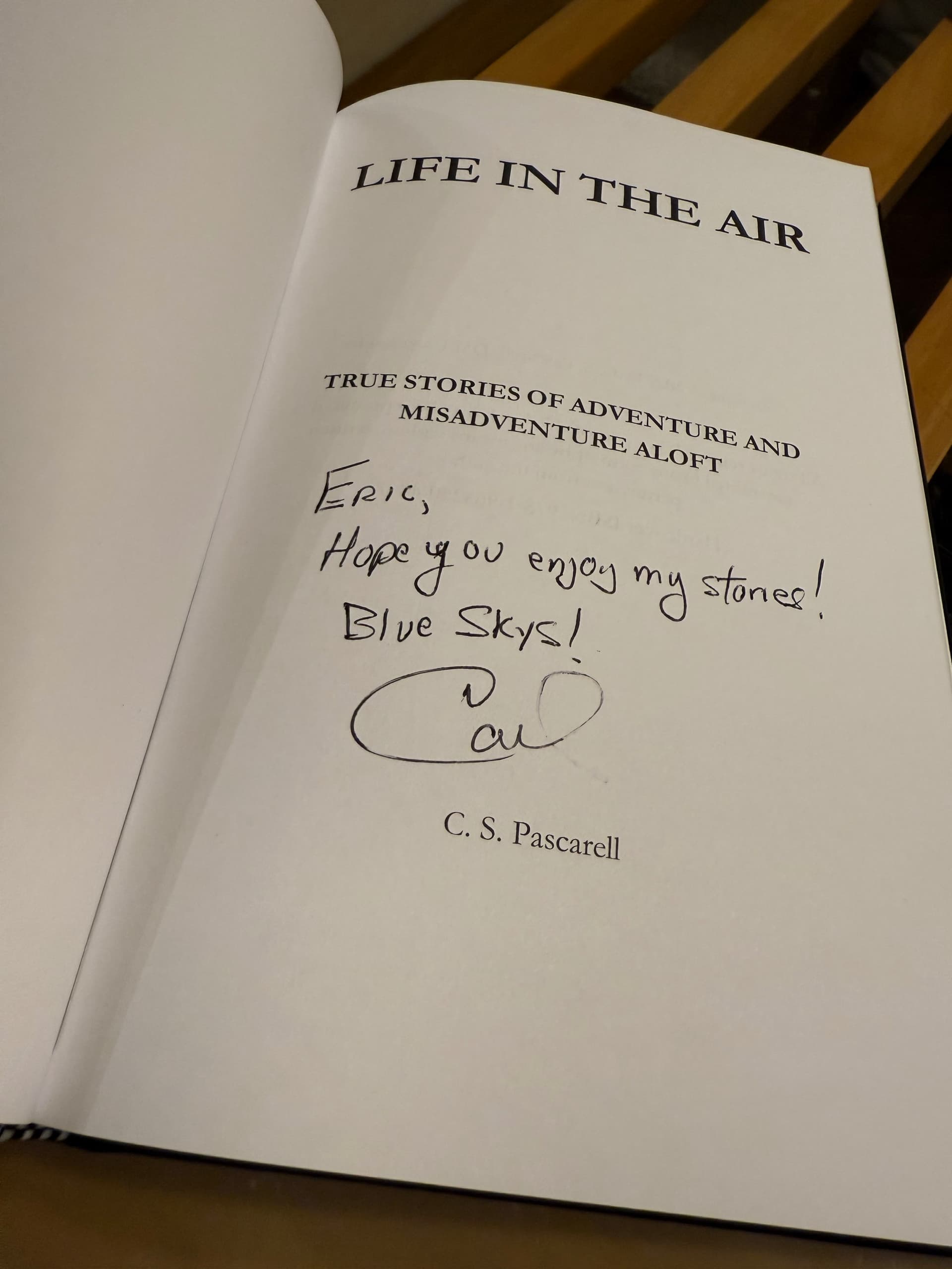 I am having quite a nice day today! This arrived in the mail. Carl was a respected pilot at my airline. I never flew with him but I knew of him. Someone pointed him out to me in the “weather room” once saying, “If you are a Pitts guy, talk to Carl.” I walked over and said hello but he was a bit distracted and rushed and we never had a chance to really chat. After he retired I leaned that he had written a memoir. I immediately bought the Kindle version but the formatting was so bad that it was unreadable. A couple of weeks ago I reached out to him on Facebook to ask if I could buy a paper edition, signed if possible. He asked for my address and I asked for his Venmo but he refused payment. What I got was a really pretty hardcover edition filled with sketches.