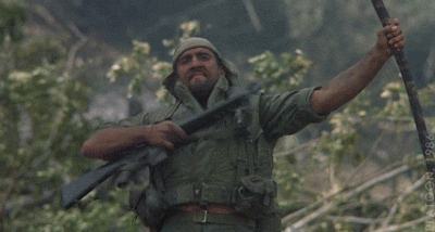 ./me Bumps fists with beach and lifts shovel and axe in defiant gesture.