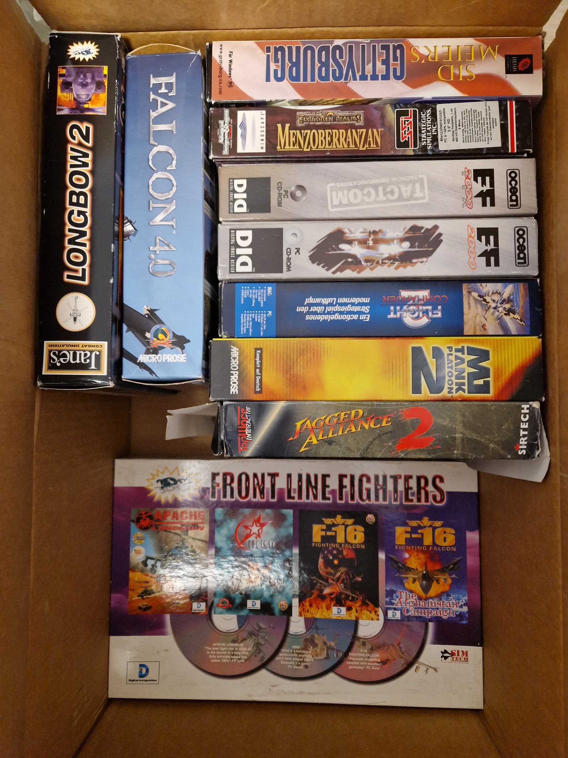 Jagged Alliance 2 is rightfully the most worn box, as I played it inside out, literally. And fond memories of Flight Commander 2 come back, really loved this turn based air combat (board game like) game.