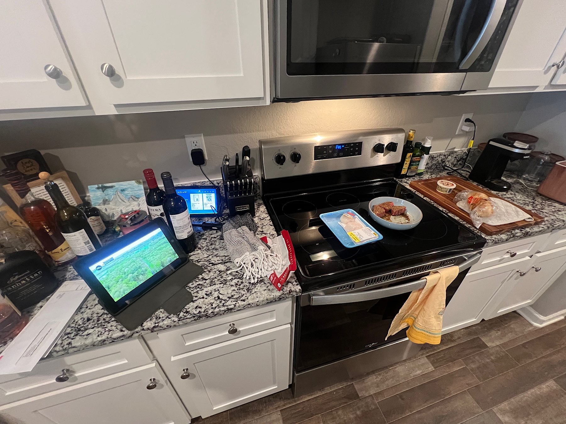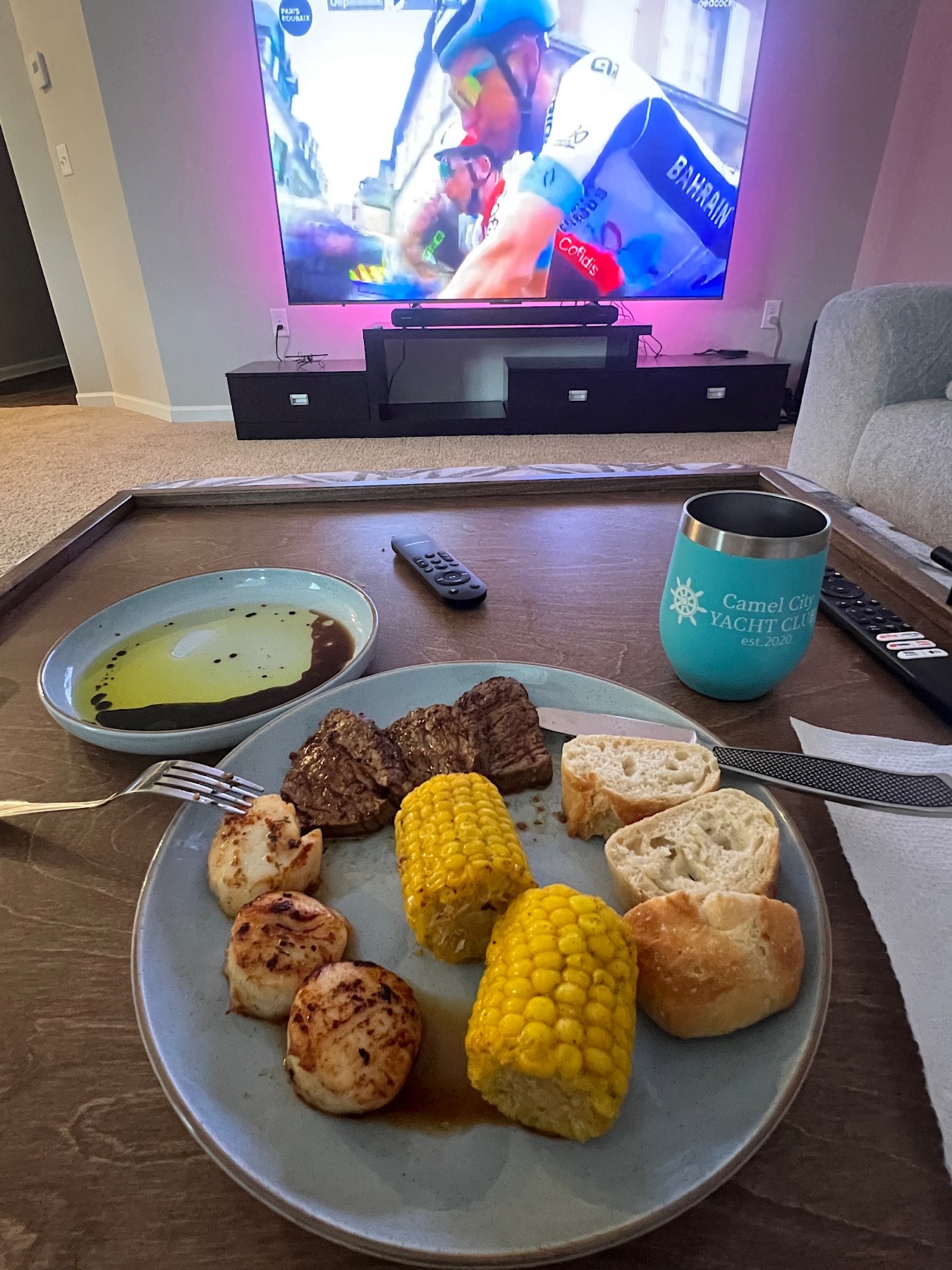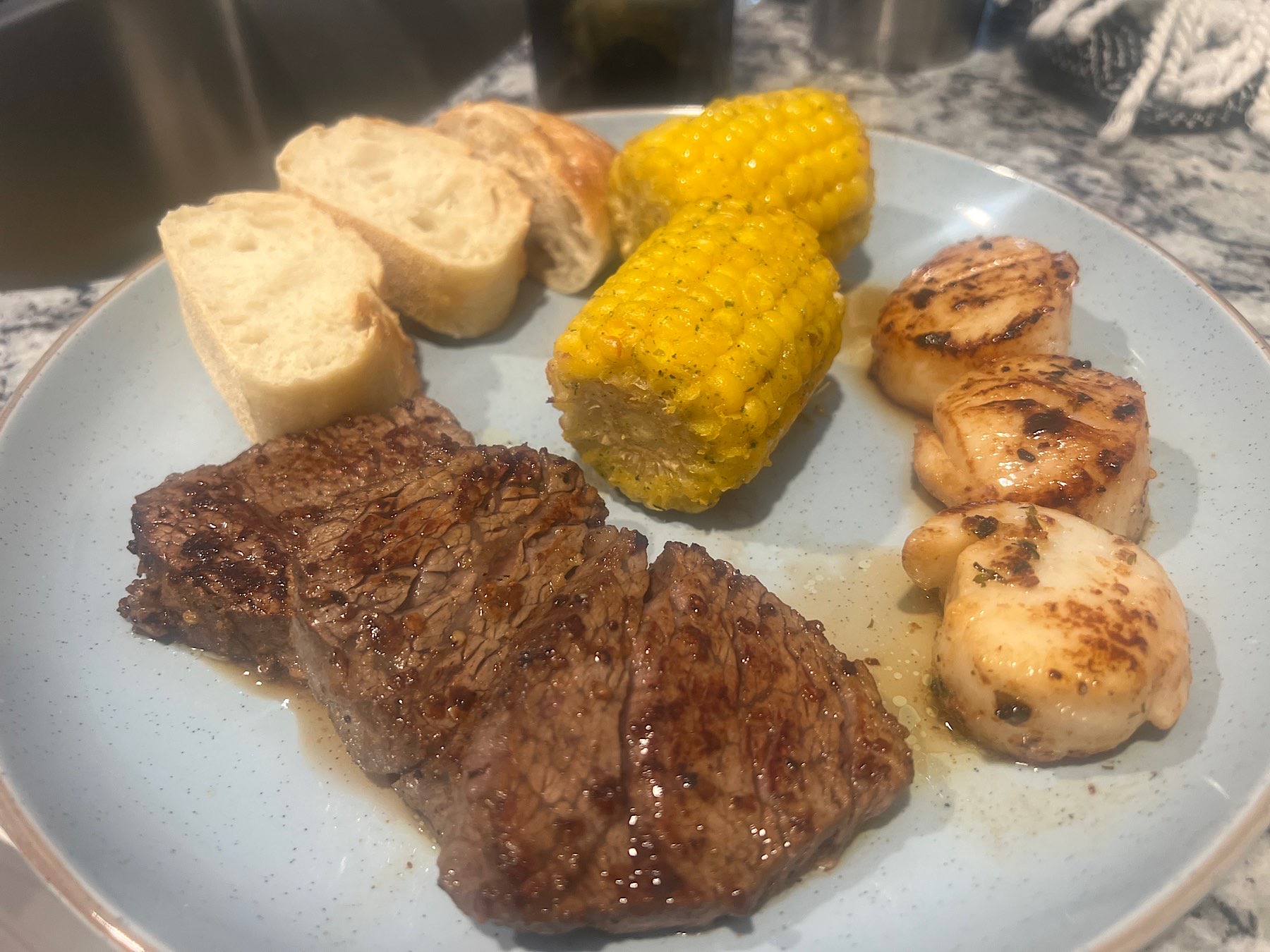 Pan seared scallops…filet medallions…street corn and some bread with olive oil and balsamic vinegar… And a bottle of wine…