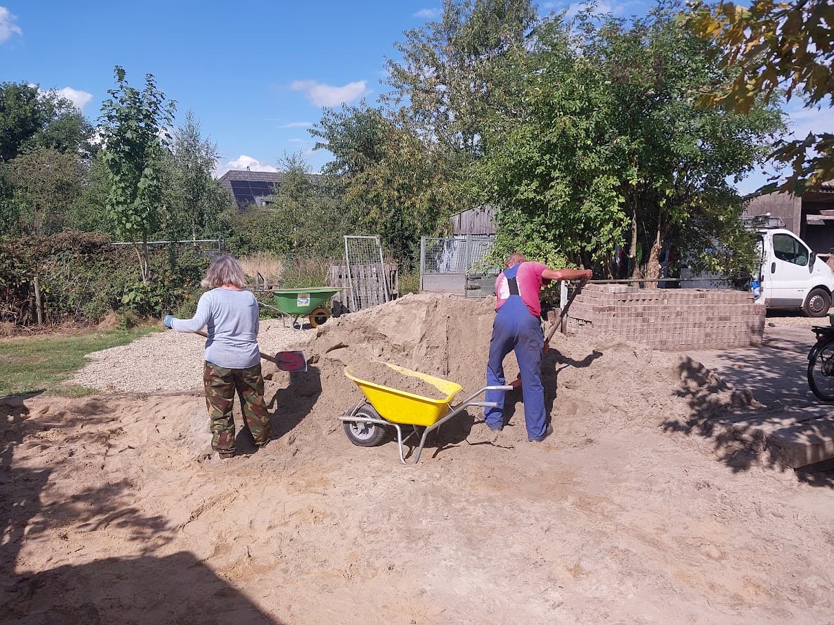 The two plant experts got shovelling duty. Which they did admirably. I did all the wheeling about. That mule sure would have come in handy! Took us six hours to move 12 cubic meters of white sand (about twenty tons I reckon) and we were all right proper knackered by the end of it.