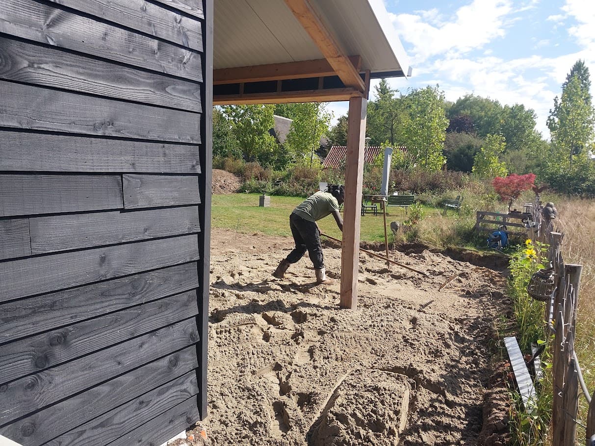 Our pavement expert taking care of my hard work. Levelling all that white sand into a state where a sweet patio can be laid out there over the coming days.