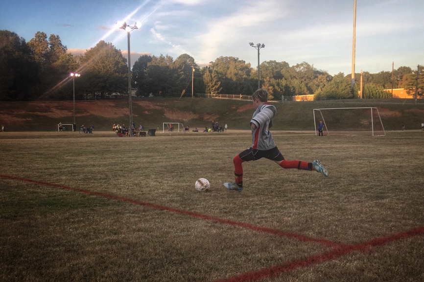 Kai with a free kick…made Daddy proud with two goals in a 5-1 win… I love watching him play…(yeah…he had a thin fracture about 3 weeks ago…all healed up but keeping the cast on as protection until next week…)