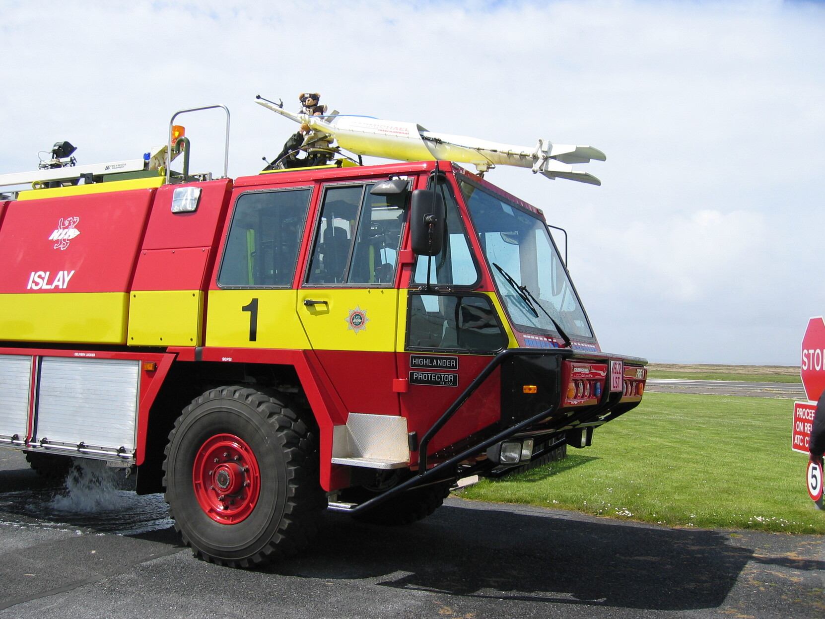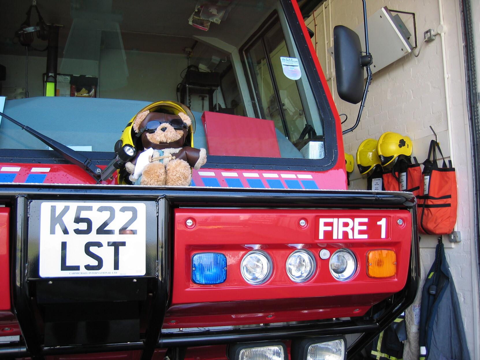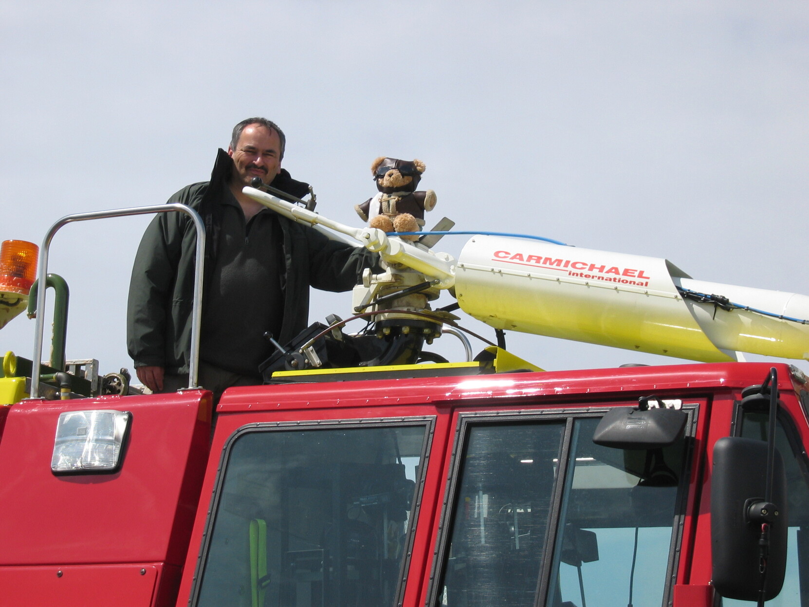 The airfield fire crew took him for a ride in their new pump. We got pictures of him in the cupola firing foam at a fuel fire and going cross country at speed.