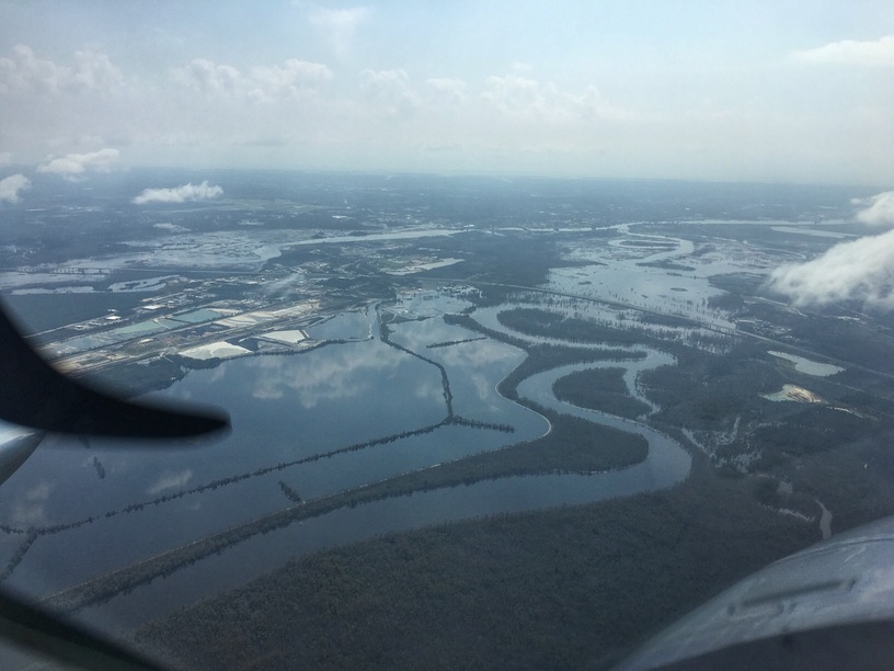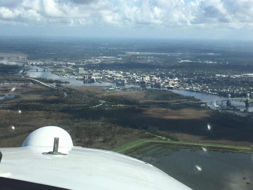 Flew over the battleship today. Flooding had looked like it might have reached the building perhaps. The Cape Fear alongside downtown doesn’t look nearly as bad as the areas north and northwest of the city. The roads up north are still underwater but some are improving…but they go up and down. Last I heard there were three routes open into the city…