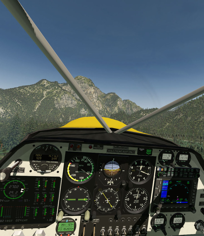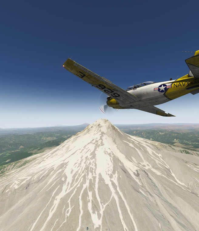 The JRollon T-34Cā¦a pretty old planeā¦but it looks fantastic in VR. Lots of smudges, scratches, and dirt on the canopyā¦and the whirling prop arc out front makes it really feel like a beast. And you can even slide into the rear cockpit. I tooled around the Mt. Hood area. Despite the high tree density, my FPS was fantastic. A hiccup or two here when loading new areasā¦but for the most part just fluid flying around some gorgeous scenery.