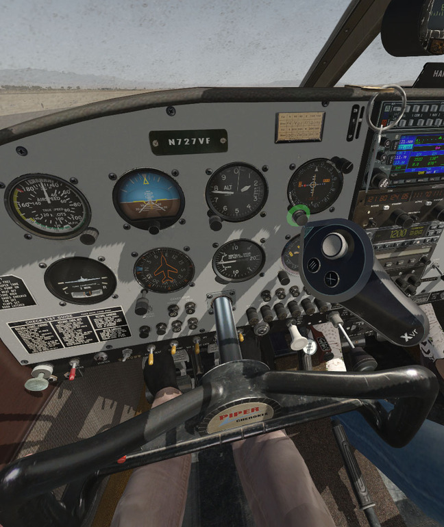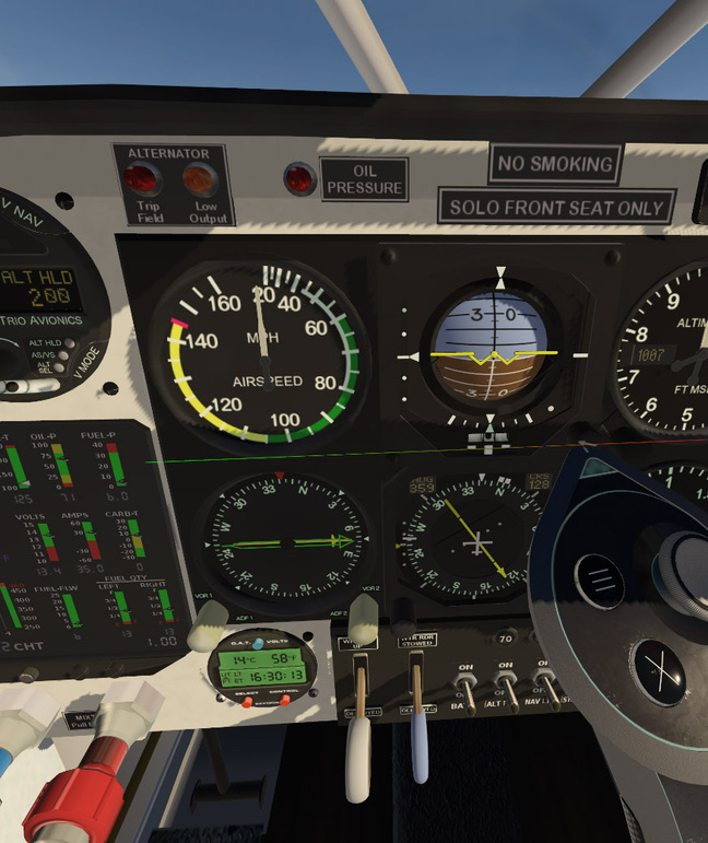 Next up the awesome Shade Tree Micro Aviation Husky. These guys make fun stuff and Iāve always been a fan. I think pretty much everything works in VR on this planeā¦and you can even grab the stick and throttle and fly purely with the Touch Controllers if you like (I prefer hardware). The ADI ball in particular is gorgeous in VRā¦here Iām using the Touch to grab the ADI adjustment and then you move your hand left/right to adjust it. Very, very intuitive and quick.
